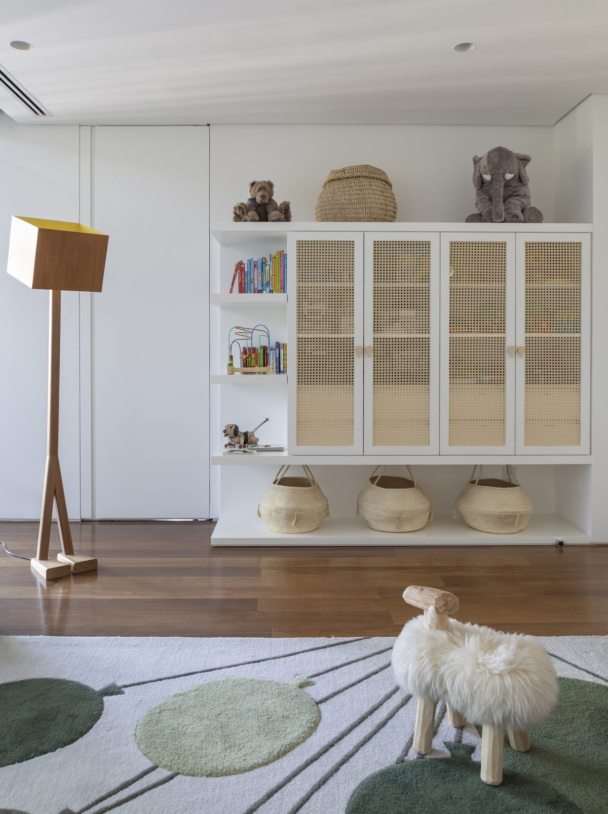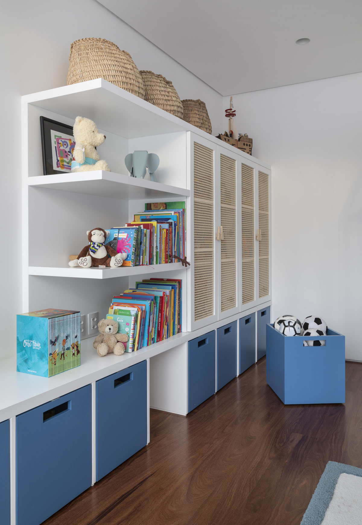 Las soluciones de almacenamiento son especialmente versátiles y adecuadas tanto para adultos como para niños. Las cajas de juguetes se sacan fácilmente de sus organizados cubos inferiores, los libros se pueden alcanzar desde los estantes más bajos, y los estantes más altos proporcionan un almacenamiento seguro para los objetos de colección favoritos, como el icónico mini elefante Eames.