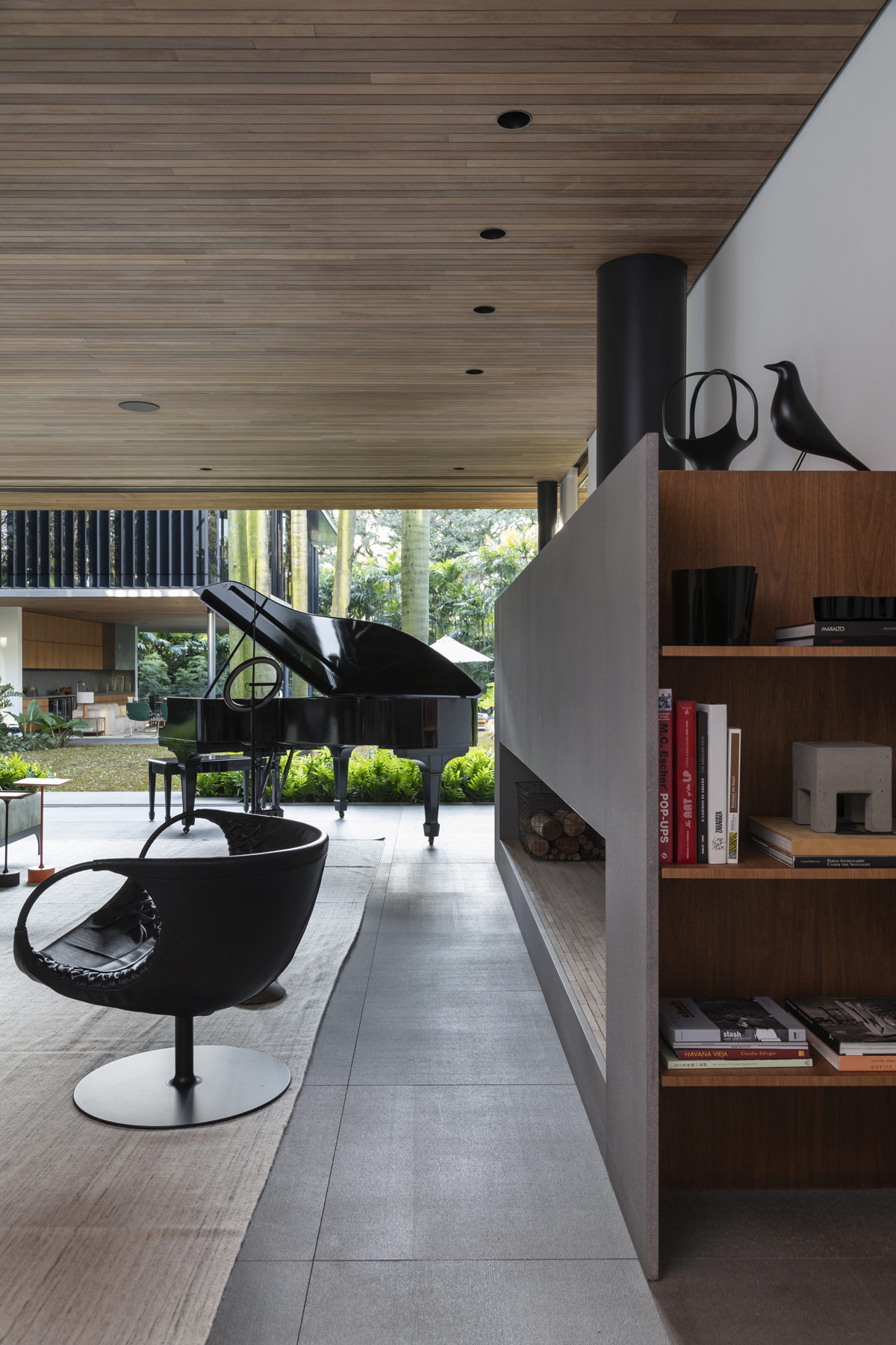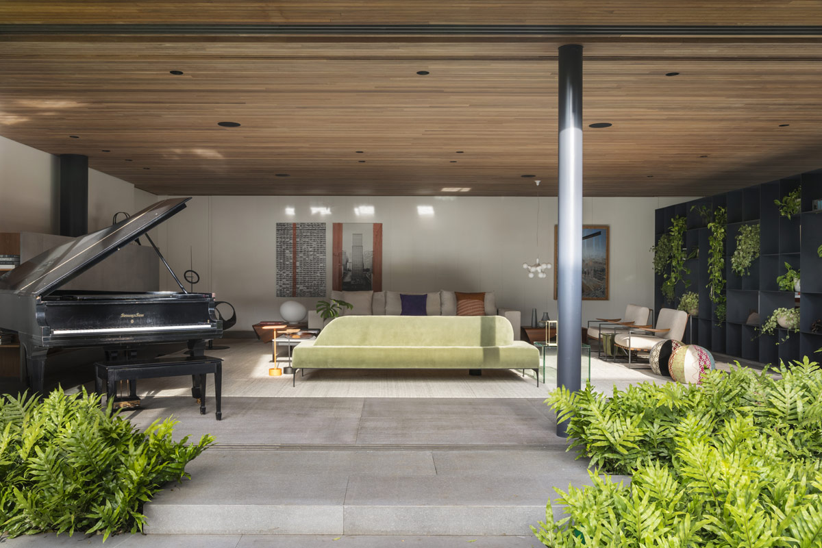 Este recorrido comienza con un espacioso salón moderno de mediados de siglo, cuya funcionalidad y diseño se basan en su ocupante estrella: el majestuoso piano negro. La acústica fue una consideración primordial, con el techo revestido de madera y el suelo enmoquetado en lana natural.