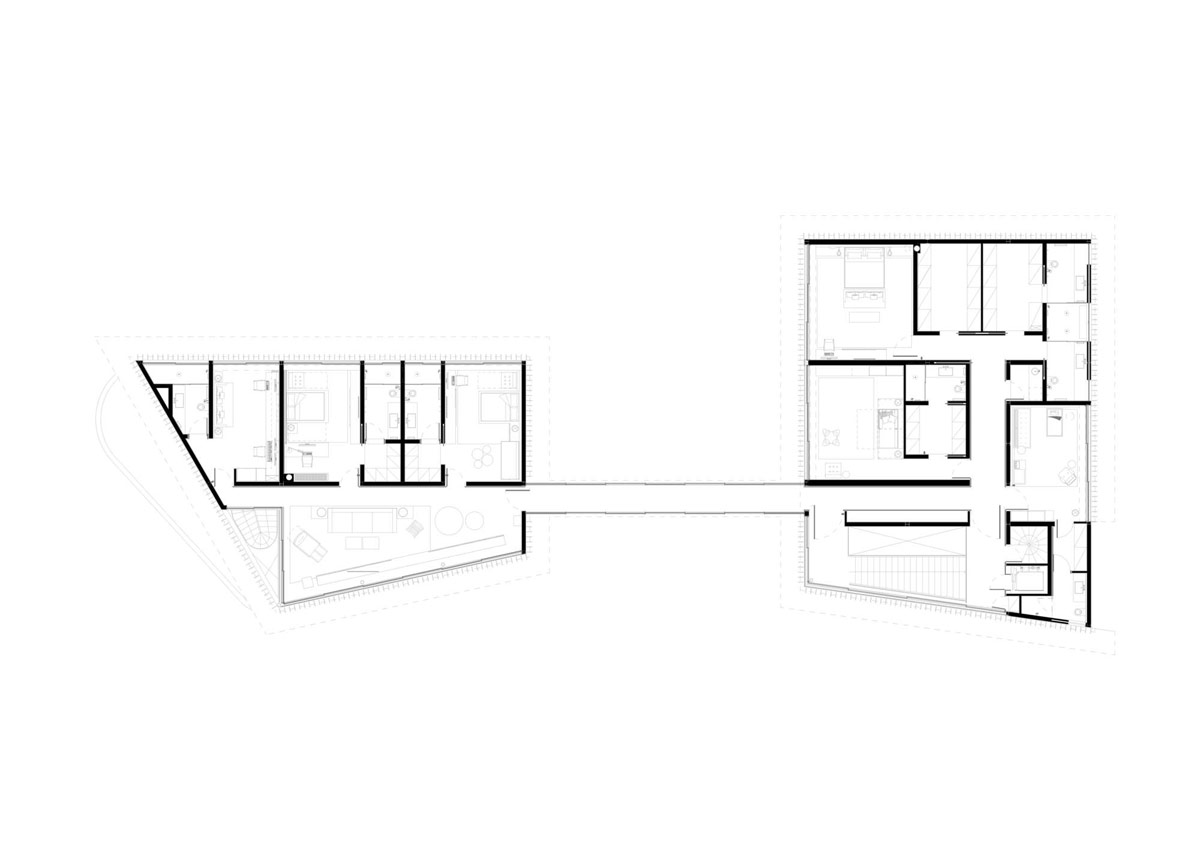 La segunda planta de cada volumen alberga dormitorios y pequeños espacios sociales.