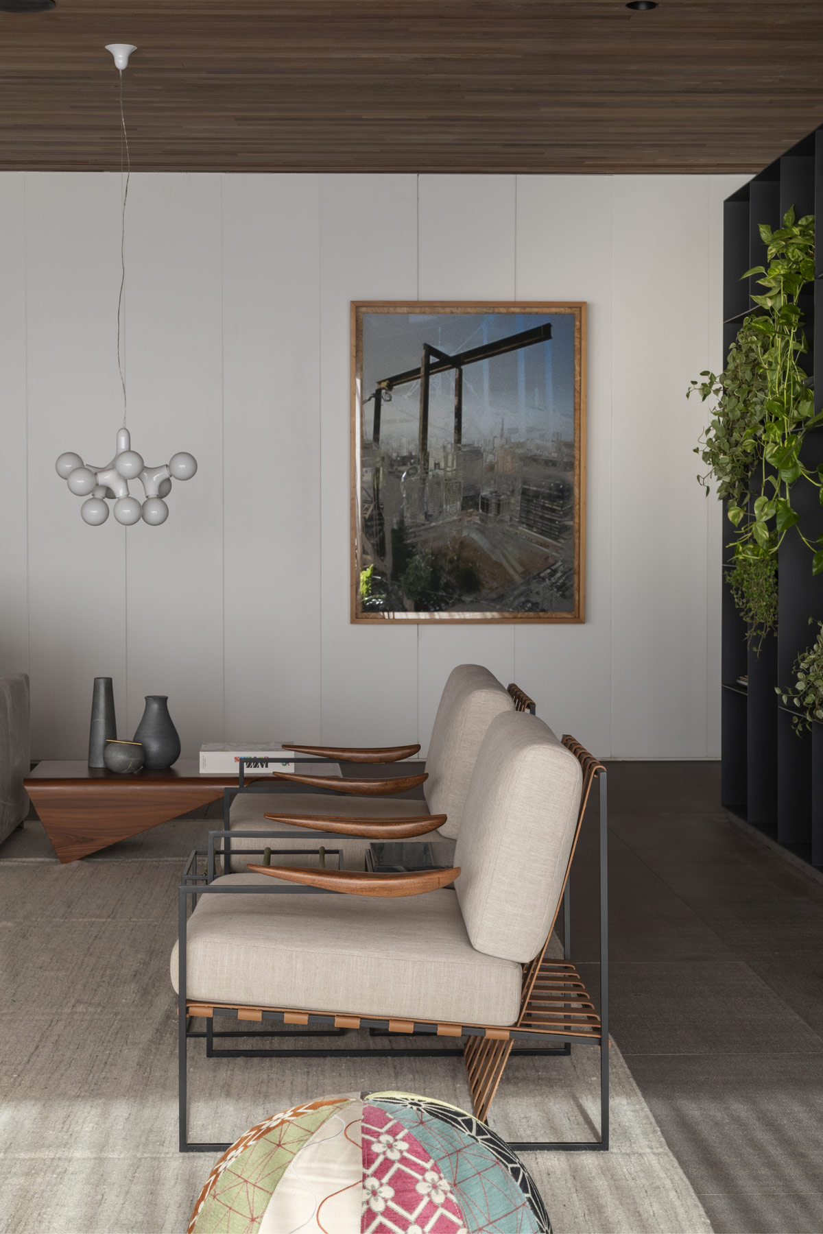 Al otro lado de la habitación, más obras de arte arquitectónicas se unen a sutiles acentos como jarrones decorativos. La lámpara colgante pertenece a la colección DNA de Hopf & Wortmann.
