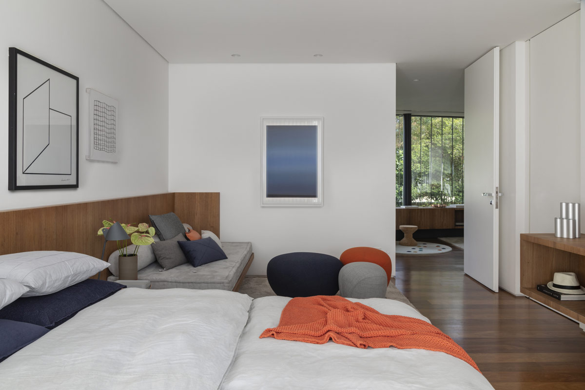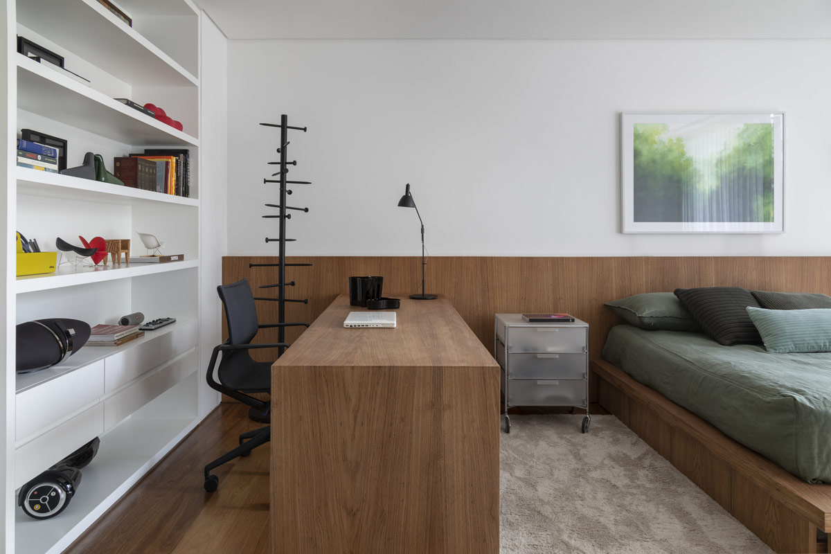 Cada uno de los dormitorios principales y de invitados ofrece su propio enfoque único de la funcionalidad. En éste, un moderno escritorio completo de oficina en casa se asoma por encima de la cama de perfil bajo para ofrecer una vista despejada de la ventana del otro lado.