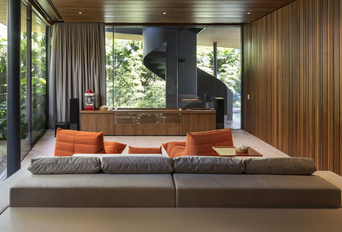Cerca, los residentes pueden disfrutar de este espacio de cine informal. Cada fila ascendente cuenta con un tipo de butaca diferente para adaptarse a las preferencias individuales de comodidad de los invitados.