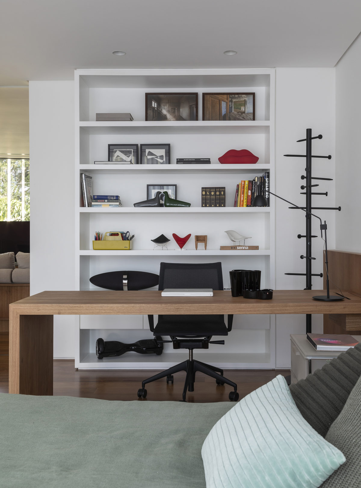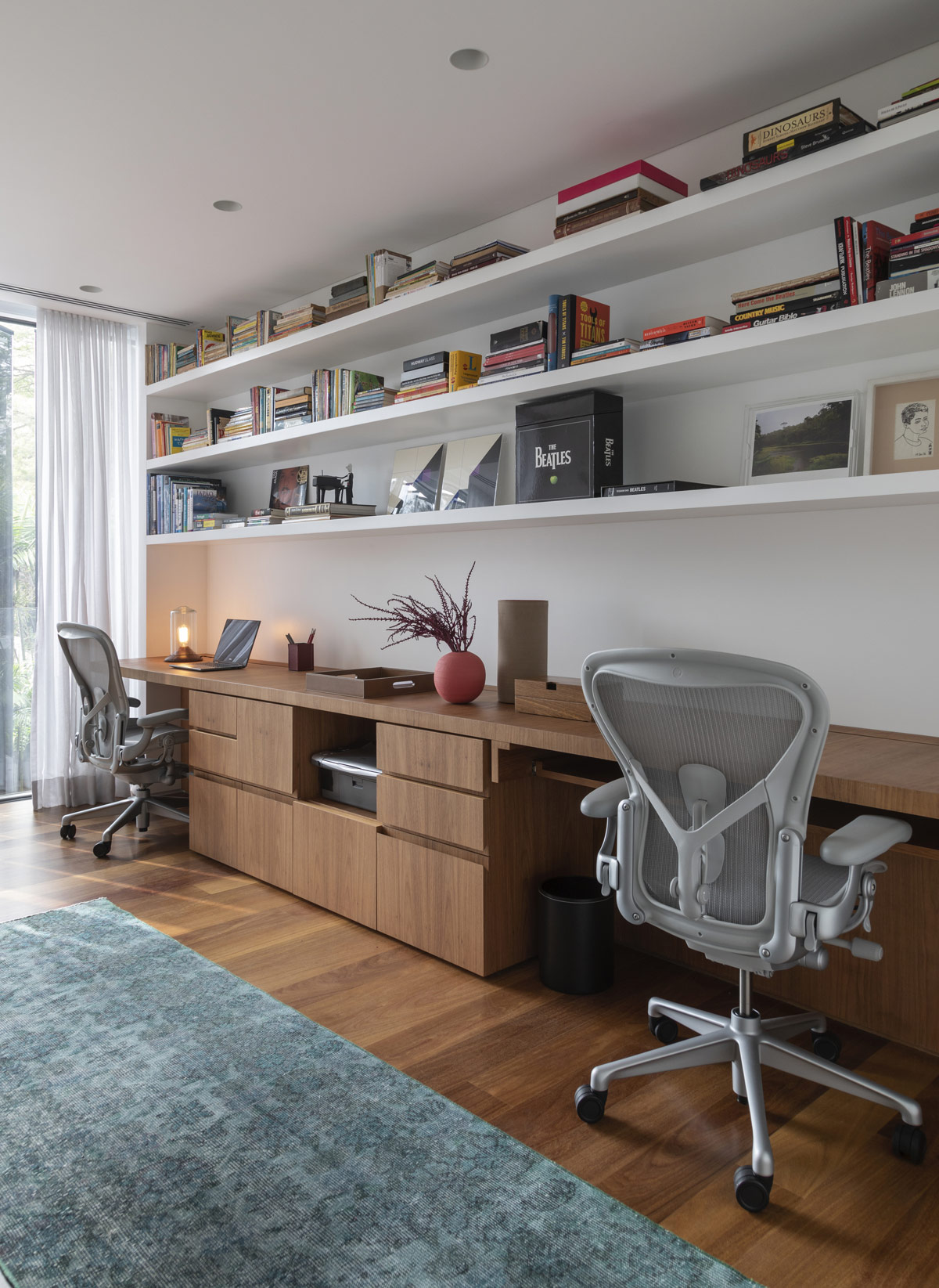 Y por último, un vistazo a la oficina en casa, elegantemente diseñada y bien equipada. Un largo escritorio ocupa toda la habitación, con estanterías igualmente generosas encima. Los residentes renuncian a la silla de ordenador estándar en favor de la famosa silla ergonómica y ajustable Herman Miller Aeron.