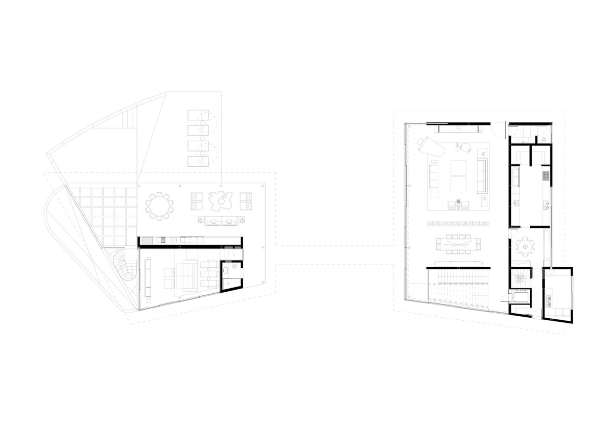 Unos cuantos planos de planta proporcionan el contexto de la distribución. La casa está dividida en dos volúmenes distintos, uno que enfatiza el entretenimiento y otro que prioriza la vida familiar cotidiana.