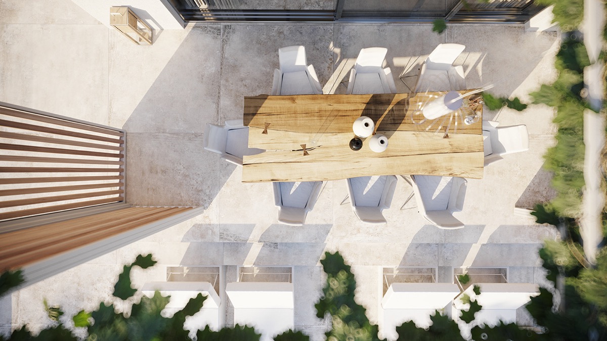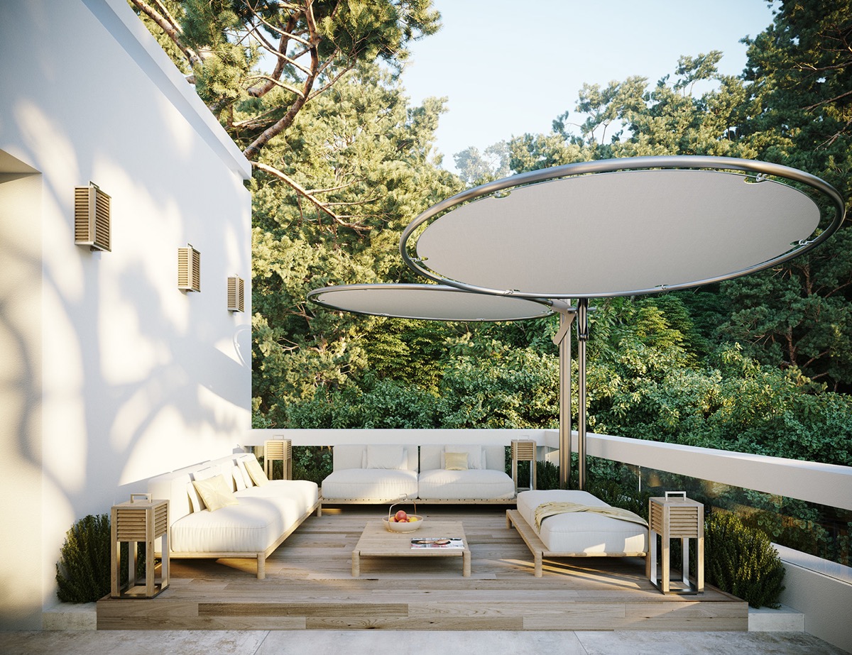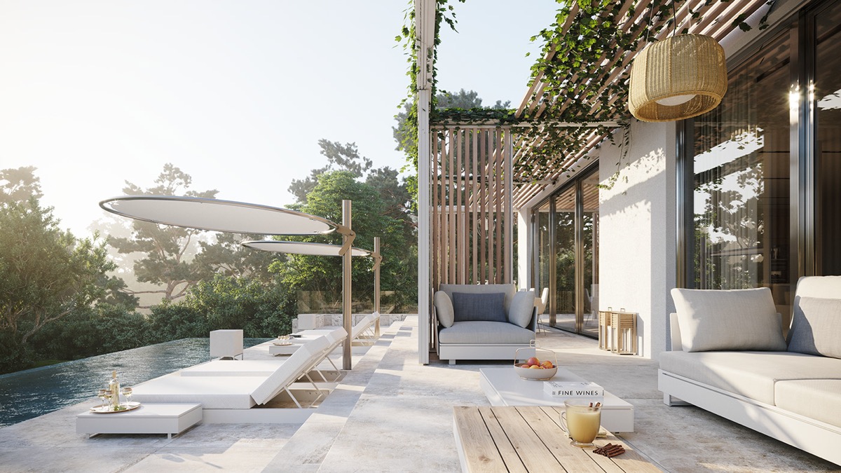 Arriba, hay un balcón con vistas a los árboles maduros y a la vegetación del jardín. Unos lujosos sofás de exterior bordean el balcón, formando otro salón al aire libre para el descanso contemplativo y la relajación. Una mesa baja de madera está preparada para sostener bebidas frías y material de lectura. Vemos una repetición de las grandes sombrillas en forma de disco que se utilizan en el patio, con su piel blanca a juego con los sofás claros y la pureza del exterior del edificio.