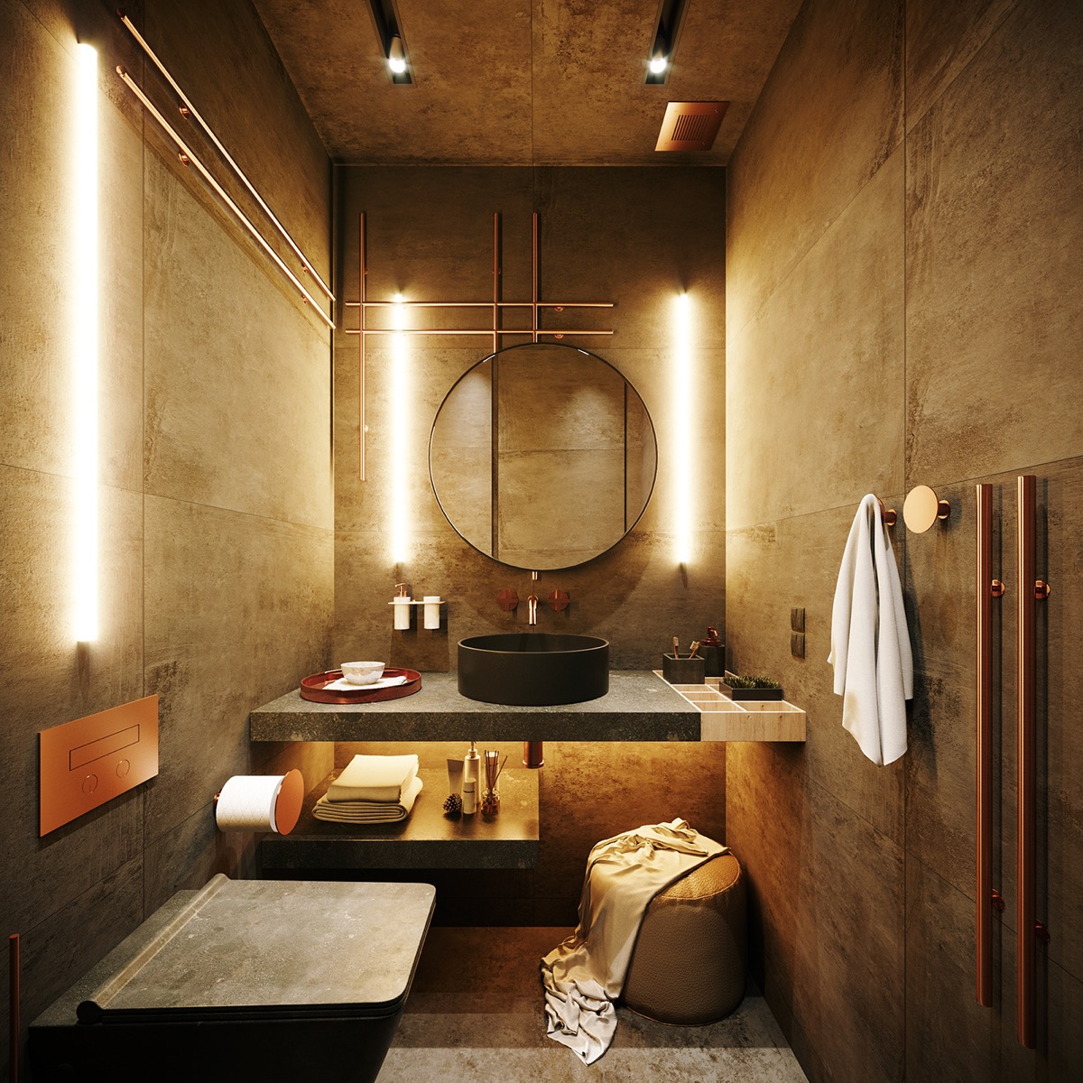 En esta ocasión, el cuarto de baño es más pequeño, aunque el espacio compacto sigue gritando lujo con sus muebles de baño hechos a medida y sus relucientes accesorios.
