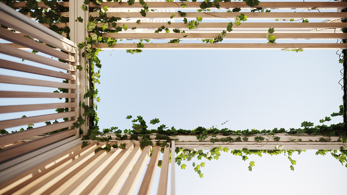 Otro diseño de pérgola rodea el salón exterior con madera natural y una encantadora hiedra. Los cortes en las lamas evitan que la zona parezca demasiado cerrada.