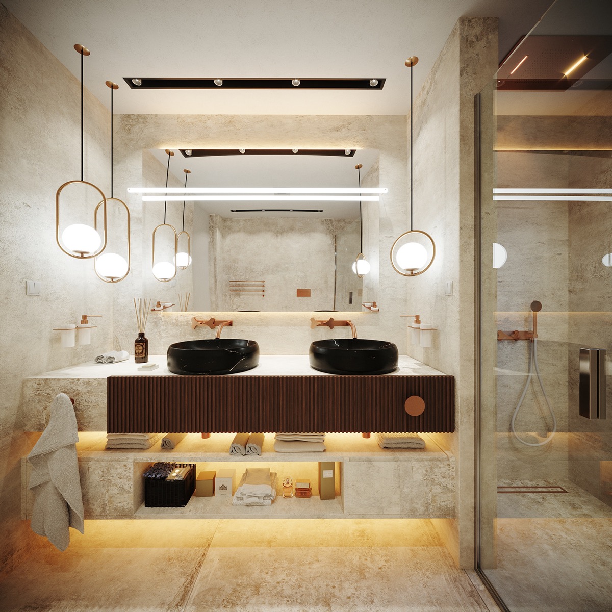 Los lavabos negros destacan en este tocador de baño de doble seno. Un panel frontal con textura equilibra las piezas oscuras.