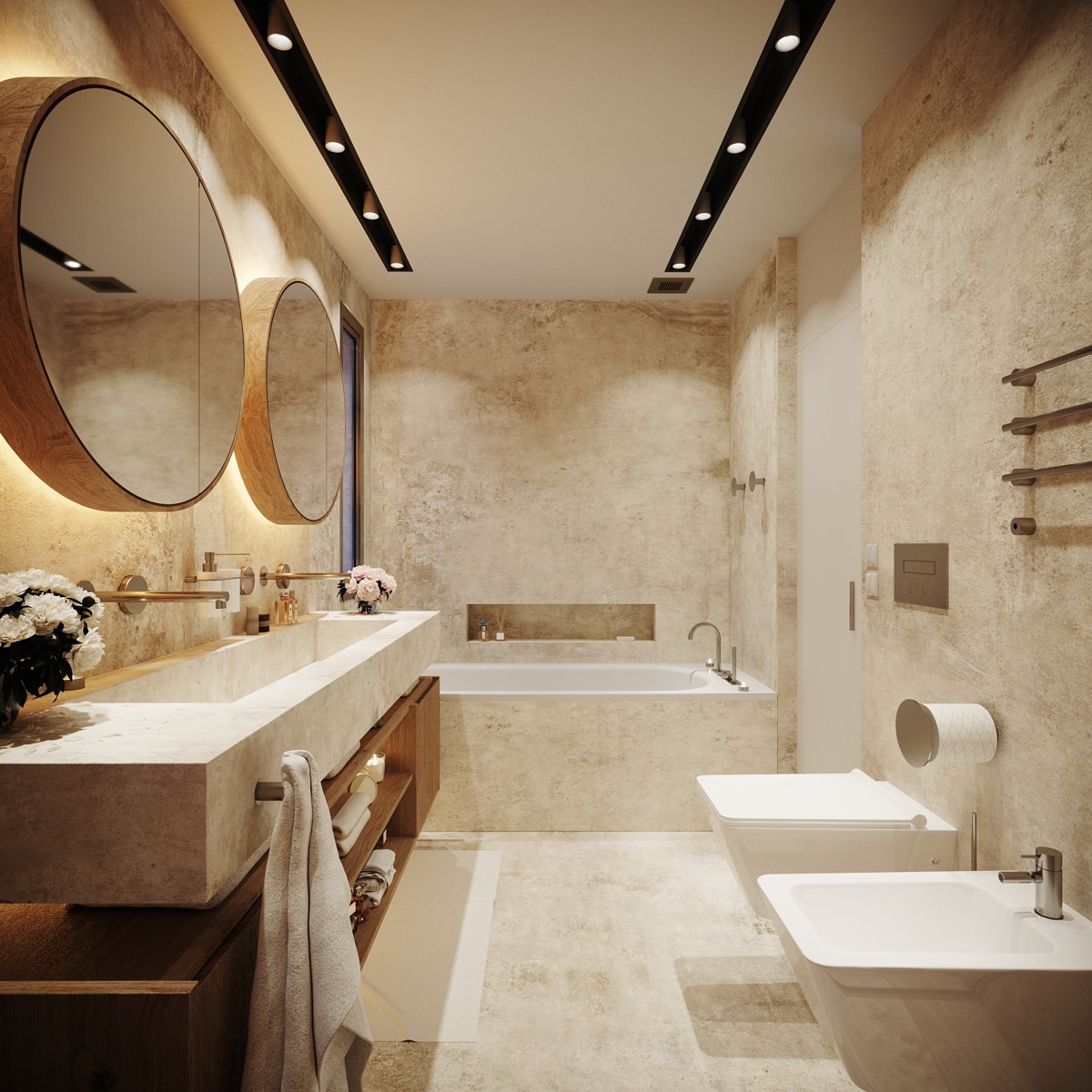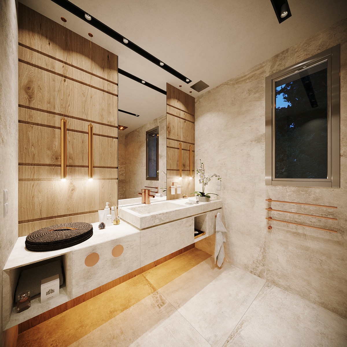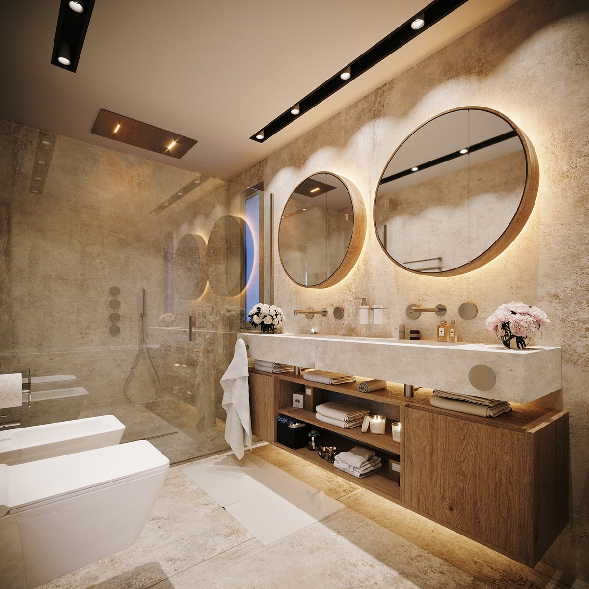 El cuarto de baño parece un mini spa, revestido de pies a cabeza con piedra texturizada y acabados de madera lisa.