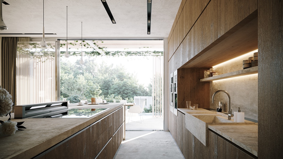 Dos hileras de armarios de madera componen la cocina de planta abierta.