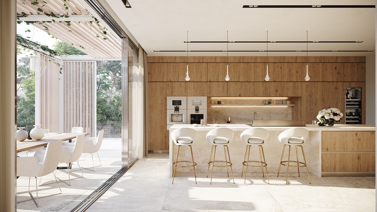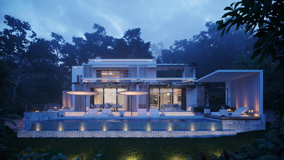 En esta villa de lujo remodelada en Cap Martinet, Ibiza, los elegantes muebles blancos contrastan con la piedra texturizada y los fondos de madera rústica. El interior de alta gama, visualizado por Tabarq, está iluminado por un esquema de iluminación contemporáneo de LEDs empotrados y esculturales lámparas colgantes.
