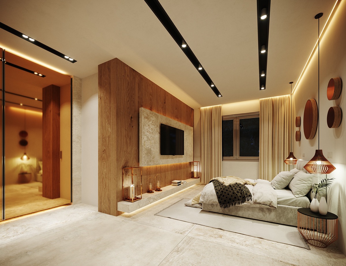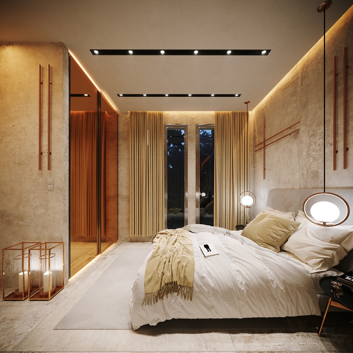La combinación de piedra blanca y fondo de madera natural continúa en los dormitorios. Este lujoso dormitorio también está bañado en un resplandor cobrizo gracias a los espejos tintados y a toda una serie de accesorios metálicos a juego.