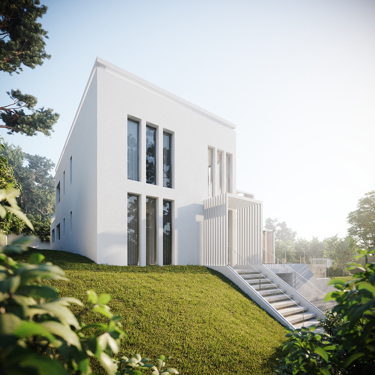 Grandes ventanales cortan el lateral del edificio. Una escalera exterior asciende por la colina cubierta de hierba hasta la entrada principal.
