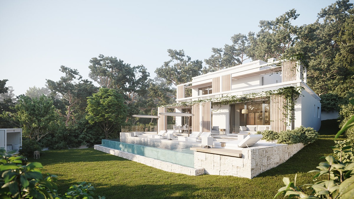 El moderno exterior de la casa se recorta en la ladera de una frondosa colina verde, rodeada de árboles maduros. El sol ibicenco incide sobre la fachada de color blanco puro del edificio.