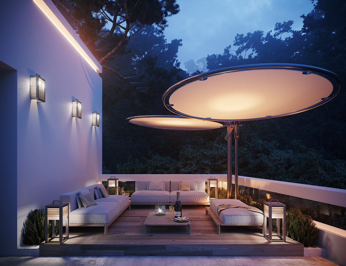Por la noche, las sombrillas se convierten en suaves lámparas que iluminan la zona de asientos. Pequeñas lámparas de pie brillan entre los sofás, mientras que los apliques de pared exteriores abren un camino de luz hacia las puertas del balcón.