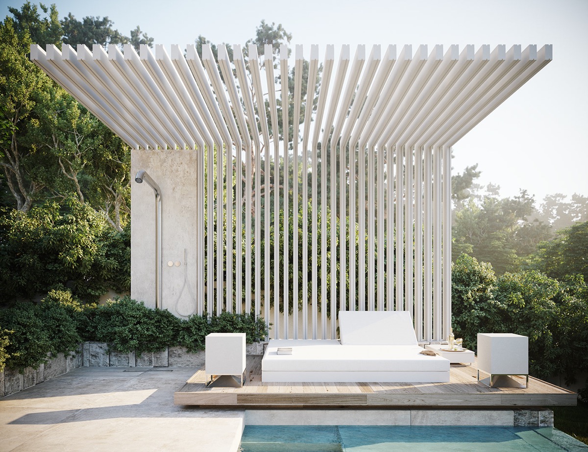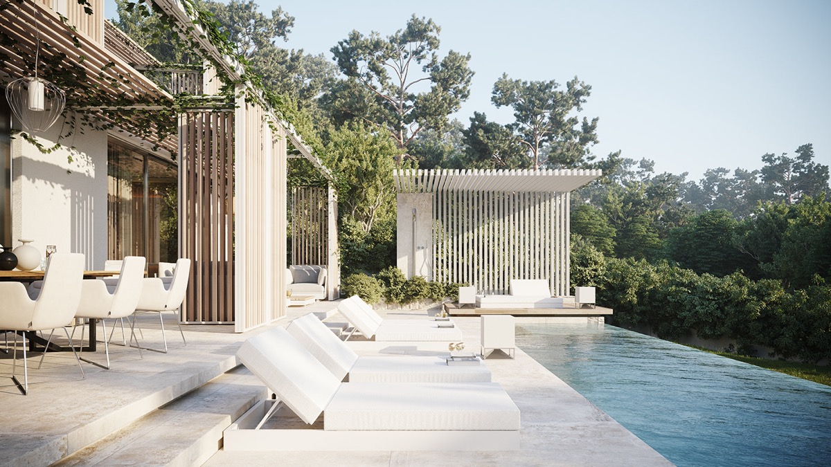 El espacio exterior está dividido en varios volúmenes, como habitaciones al aire libre. Al borde de la piscina infinita, frente a un comedor al aire libre, hay tumbonas de lujo. En la cabecera de la piscina hay un solárium más separado, con vistas al jardín. En el extremo más alejado, junto a la casa, hay una sala de estar exterior.