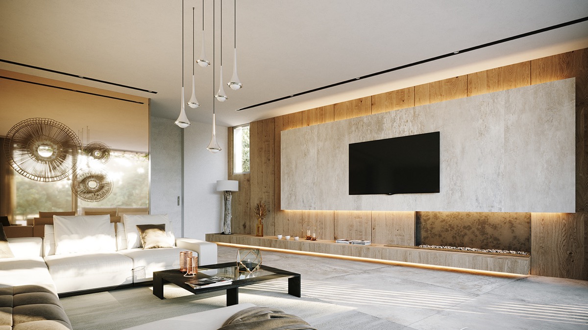 El moderno sofá en forma de U se reúne en torno a un televisor de pantalla plana montado en la pared. La decoración de la pared del televisor es una hermosa combinación de piedra blanca y paneles de madera natural. La chimenea está situada a un lado de un hogar elevado. El mueble se ha iluminado con tiras de LED para acentuar su efecto flotante. Una pequeña colección de libros y adornos decora su superficie.