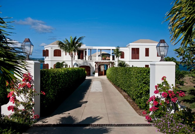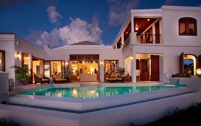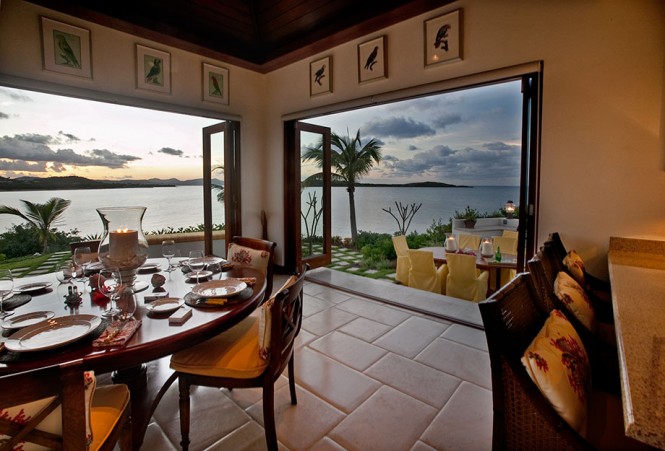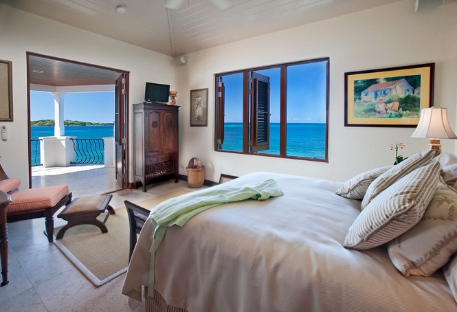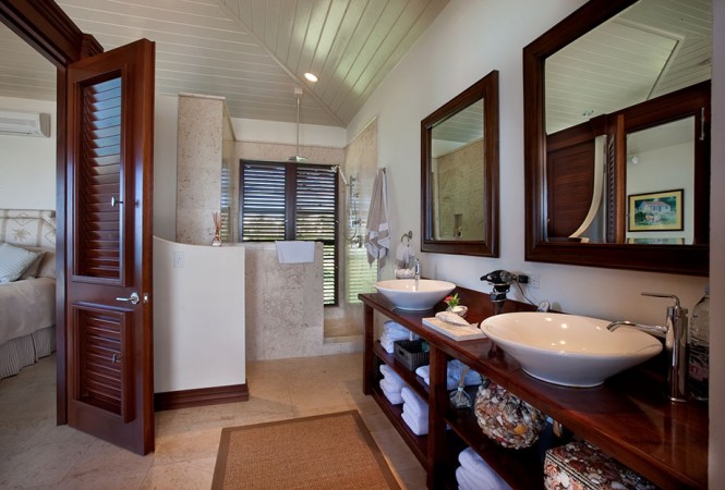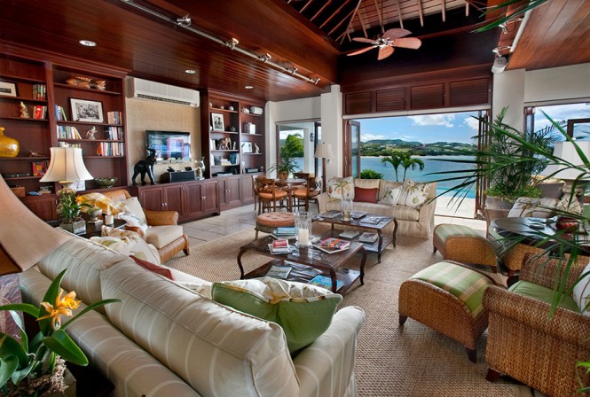 La impresionante villa se articula en torno a un gran salón decorado con gusto, amueblado con una fusión tropical de sofás de ratán, piezas antiguas de las Indias Occidentales y obras de arte originales colocadas en estanterías hechas a medida con madera de andiroba a lo largo de toda una pared. Se han colocado puertas francesas en el lado del océano para abrir el espacio a los refrescantes vientos alisios de Santa Cruz.