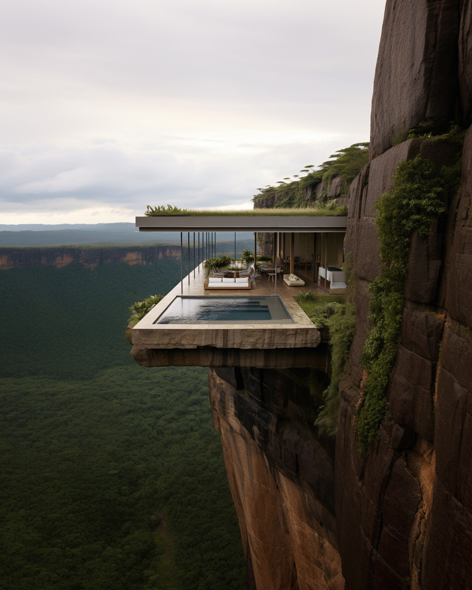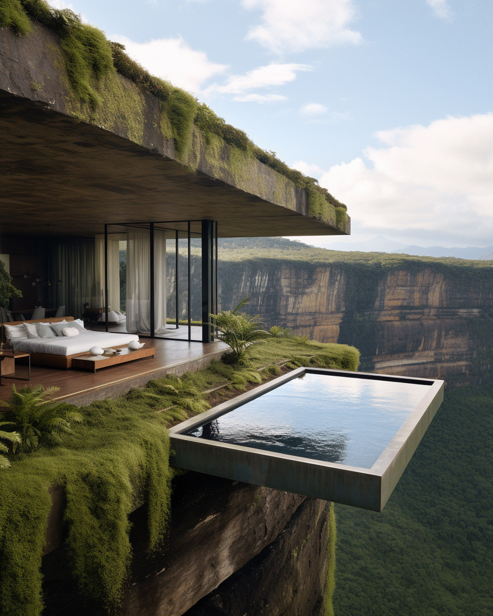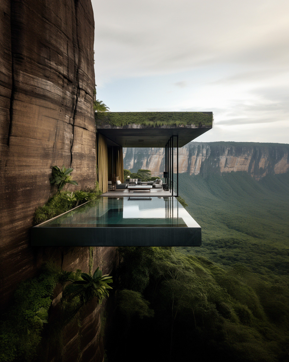 En esta creación de Midjourney, descubrimos un lujoso diseño de casa que se aferra a la escarpada ladera de una montaña, como un nido de cuervos. Su terraza en voladizo y su zona de estar al aire libre se ciernen amenazadoras sobre el abismo.