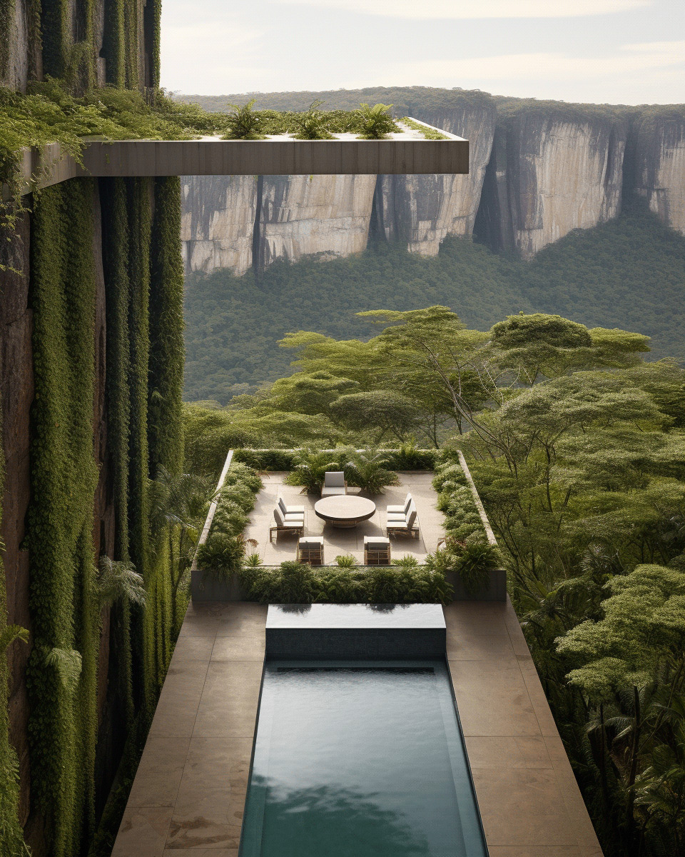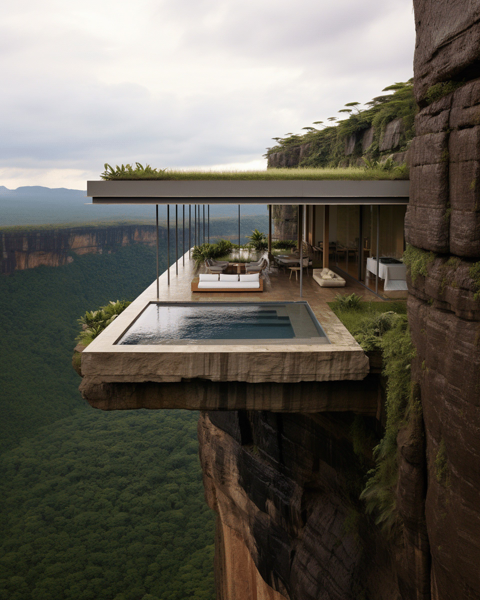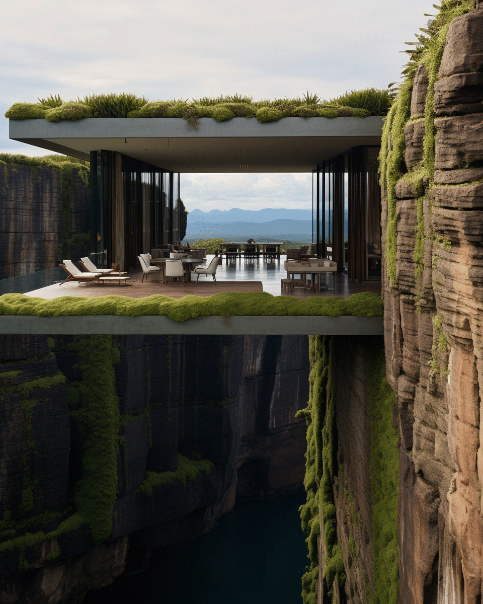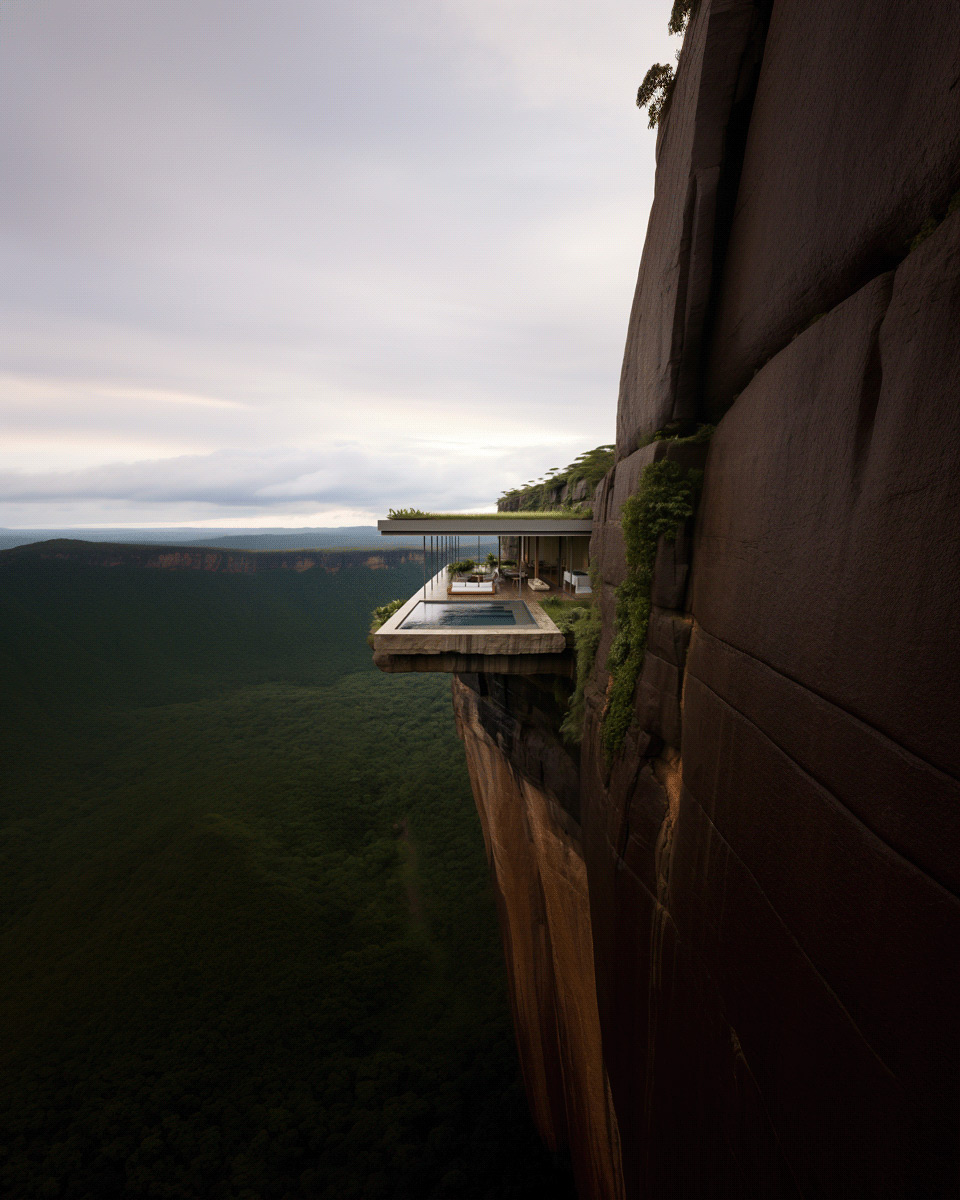 En esta creación de Midjourney, descubrimos un lujoso diseño de casa que se aferra a la escarpada ladera de una montaña, como un nido de cuervos. Su terraza en voladizo y su zona de estar al aire libre se ciernen amenazadoras sobre el abismo.