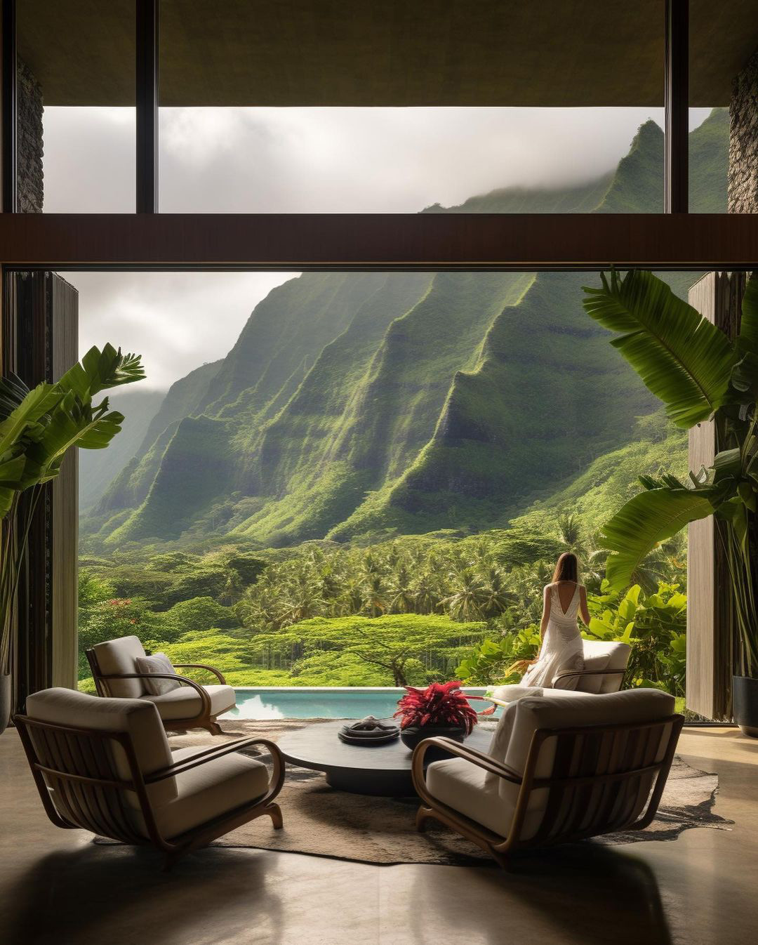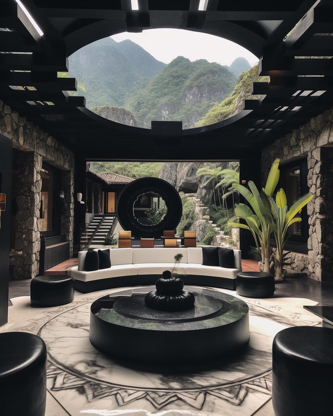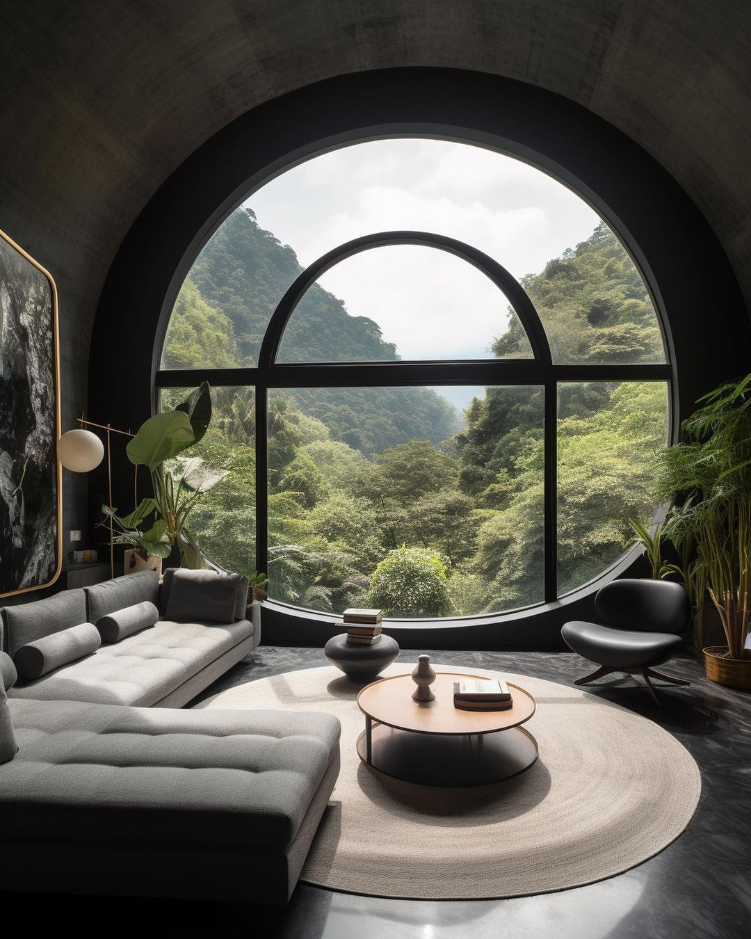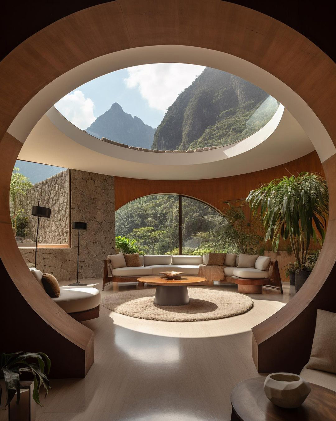 En el interior de la casa generada por la IA, las ventanas de doble aspecto dan la bienvenida a un panorama impresionante. Una mesa de centro con bordes vivos llena el salón de belleza natural.