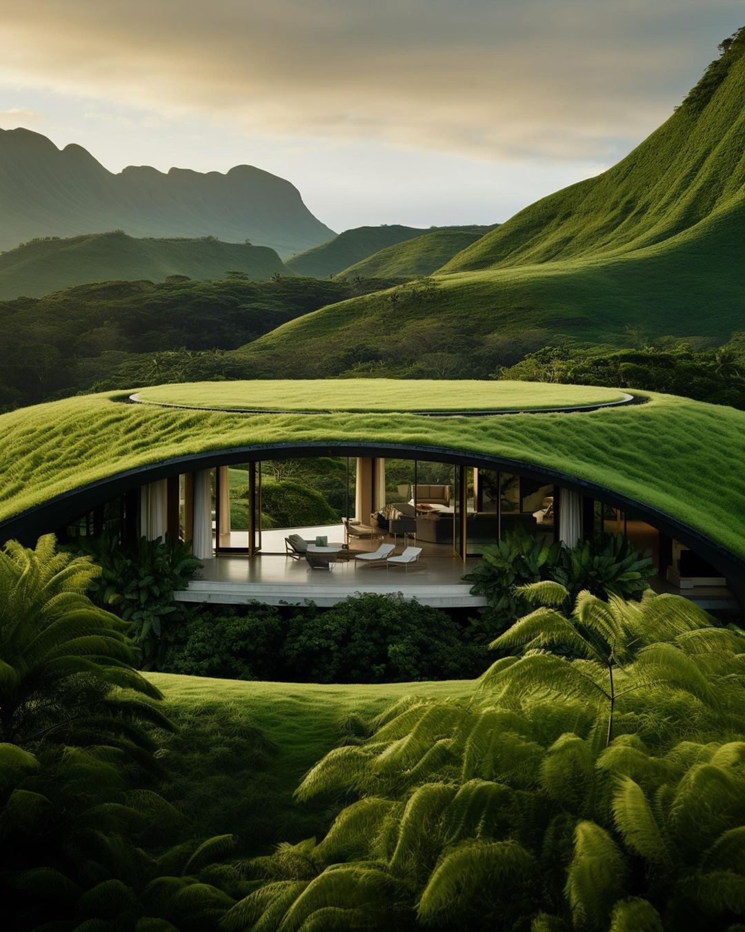 Esta casa de ensueño generada por inteligencia artificial está enclavada en un exuberante paisaje de hierba. Una almohada de vegetación corona el tejado de la casa perfectamente circular.