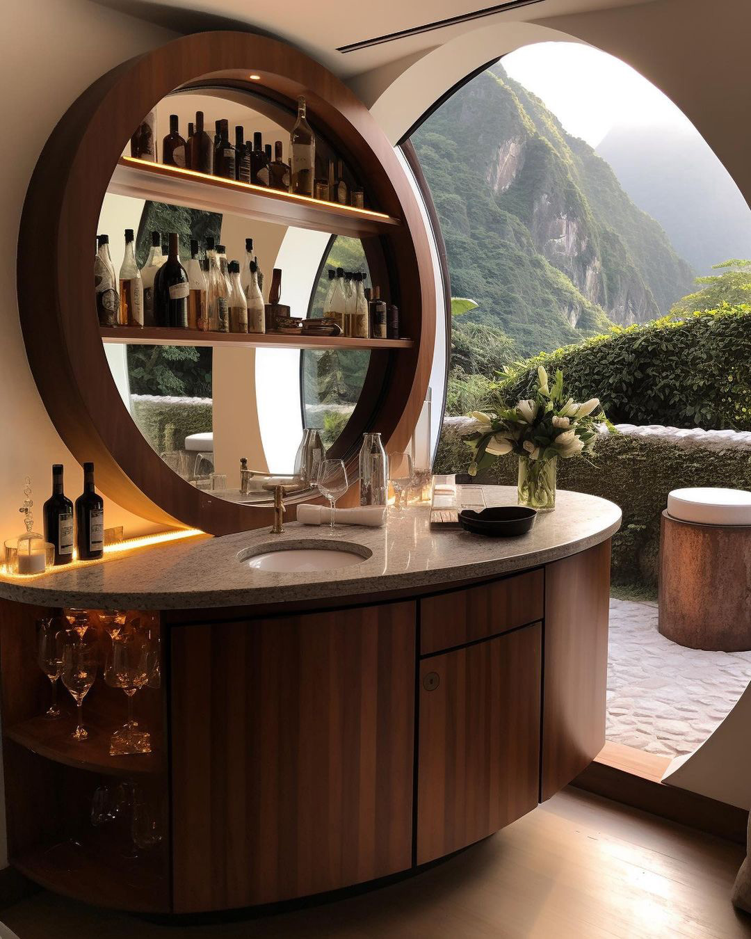 Incluso el bar de la casa recibe un tratamiento de diseño fresco y curvilíneo con una estantería circular y un mostrador en forma de media luna. En el patio hay taburetes redondos.