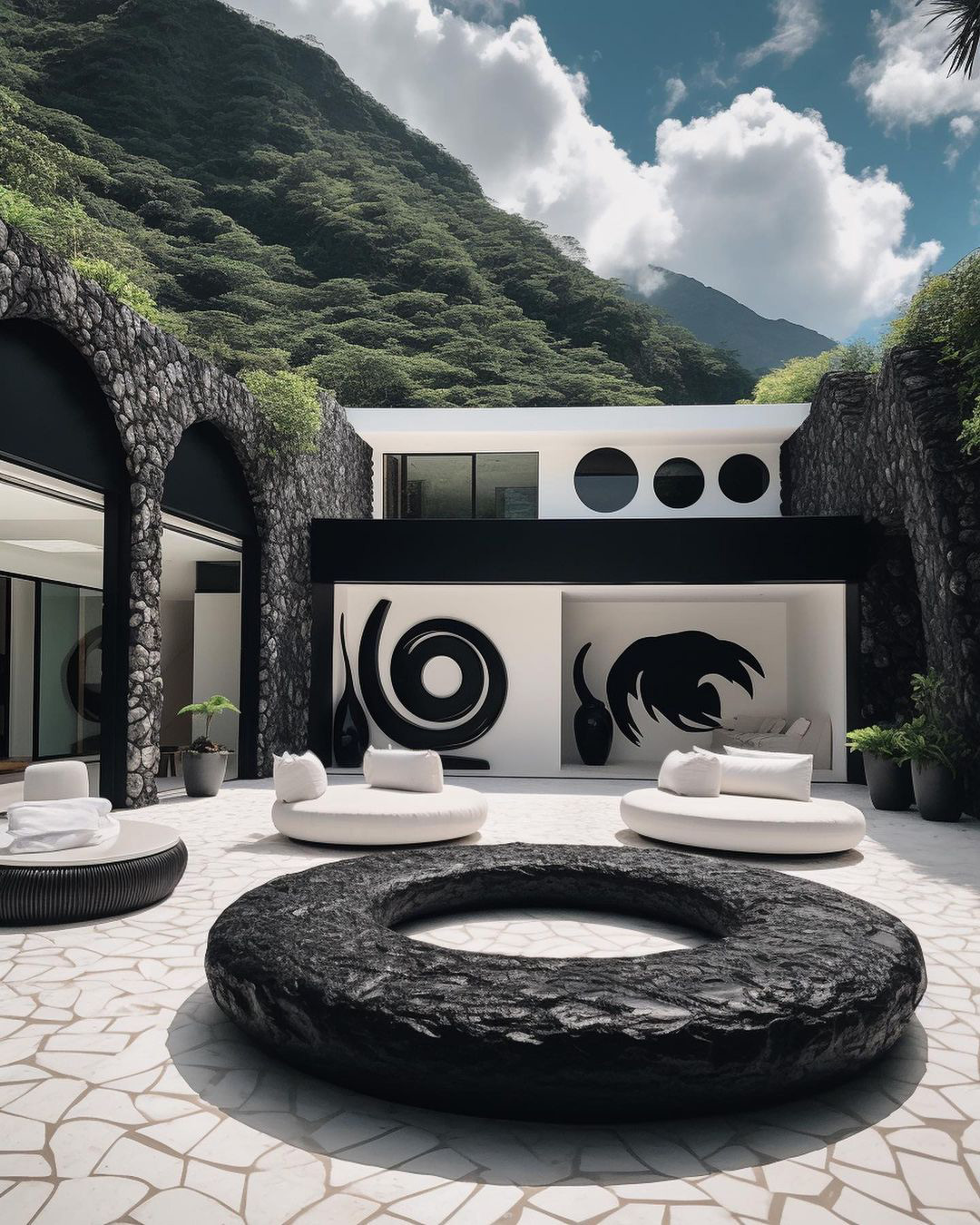 El tema de la forma circular se mantiene fuerte en todo el diseño de la casa generado por IA. Muebles de exterior redondeados llenan la terraza