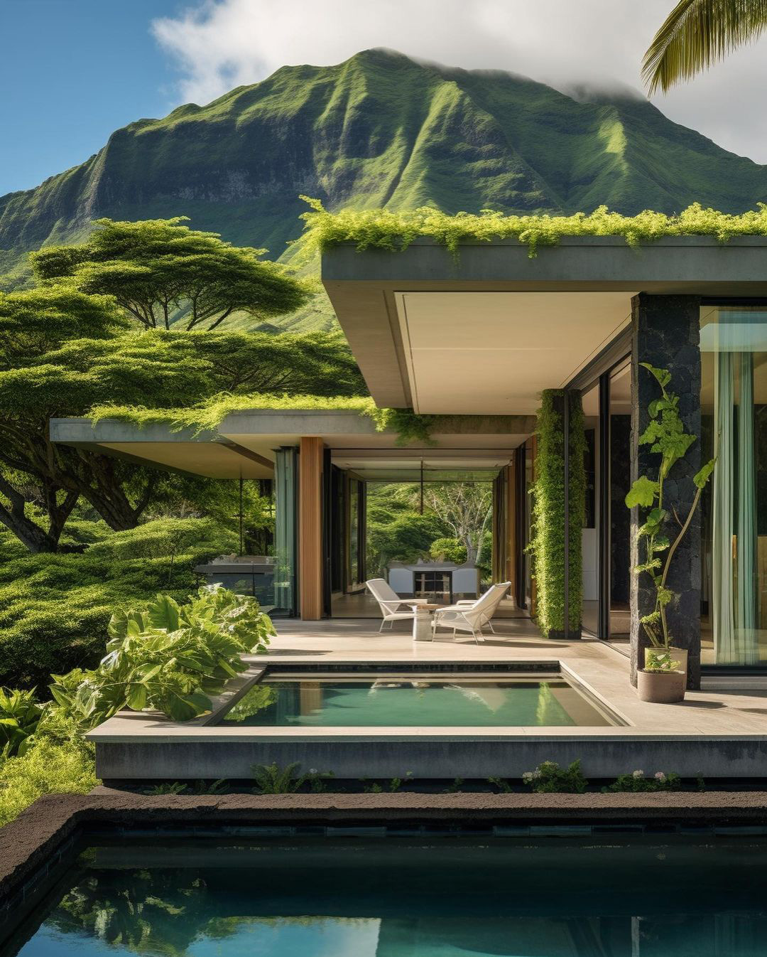 El entorno generado por la IA crece por encima de la construcción de la casa, integrando el edificio con gracia en su entorno.