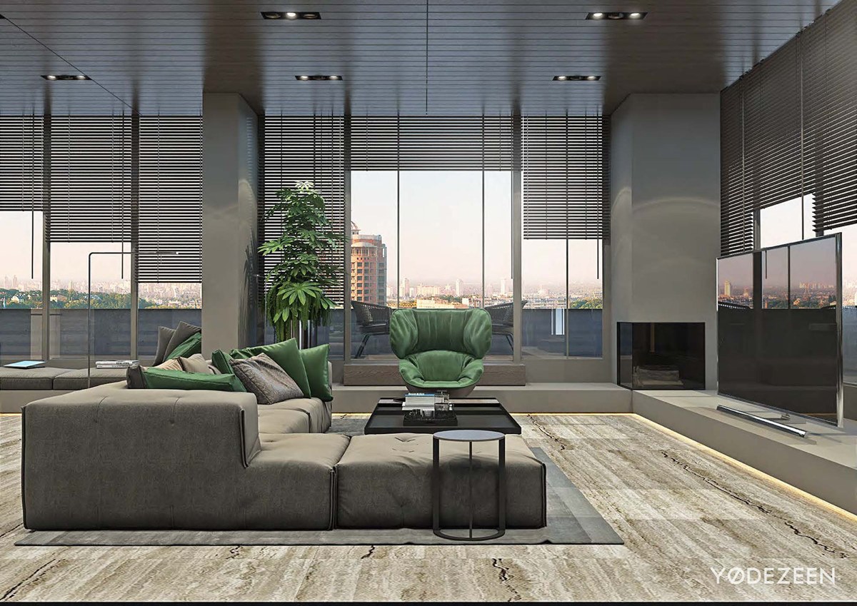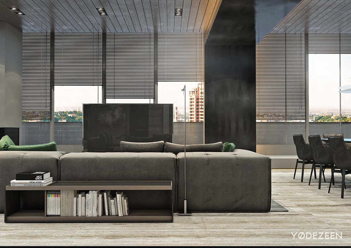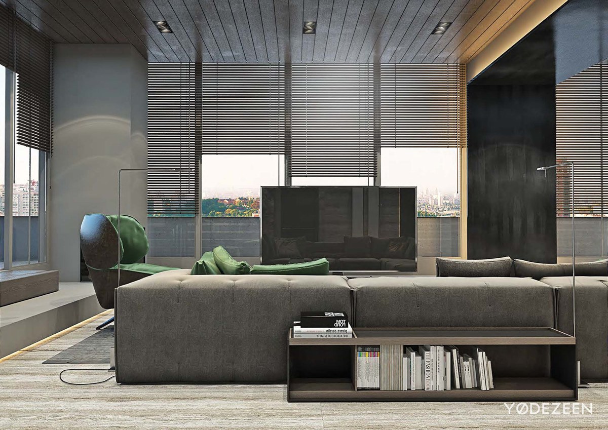 La mesa de centro detrás del sofá utiliza libros como adornos, dando a la habitación una esencia distinguida. La habitación saca el máximo partido de la combinación de colores monocromática, con los acentos verdes iluminando la habitación. Las persianas hacen juego con los paneles del techo, atrayendo la mirada hacia la impresionante vista.
