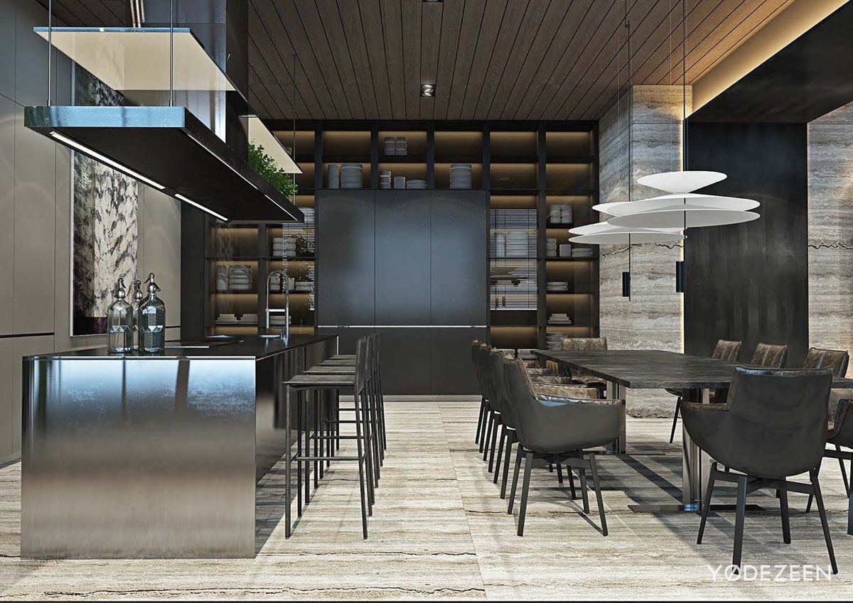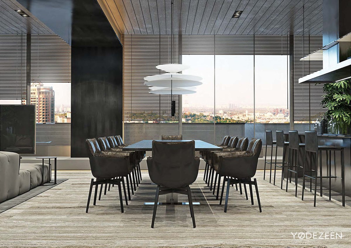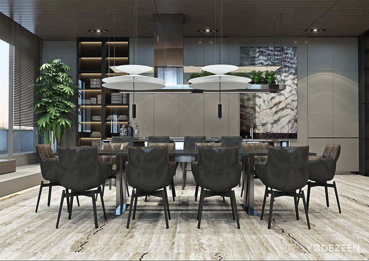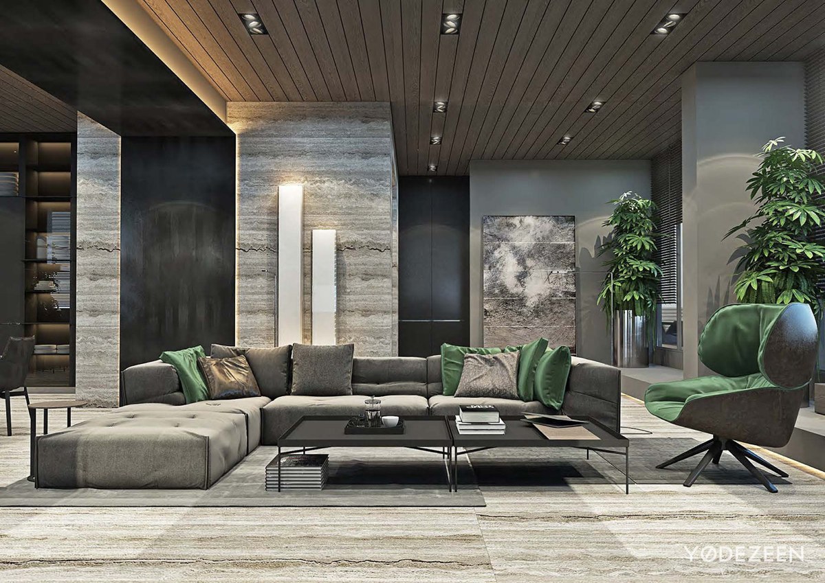 La mesa de centro detrás del sofá utiliza libros como adornos, dando a la habitación una esencia distinguida. La habitación saca el máximo partido de la combinación de colores monocromática, con los acentos verdes iluminando la habitación. Las persianas hacen juego con los paneles del techo, atrayendo la mirada hacia la impresionante vista.