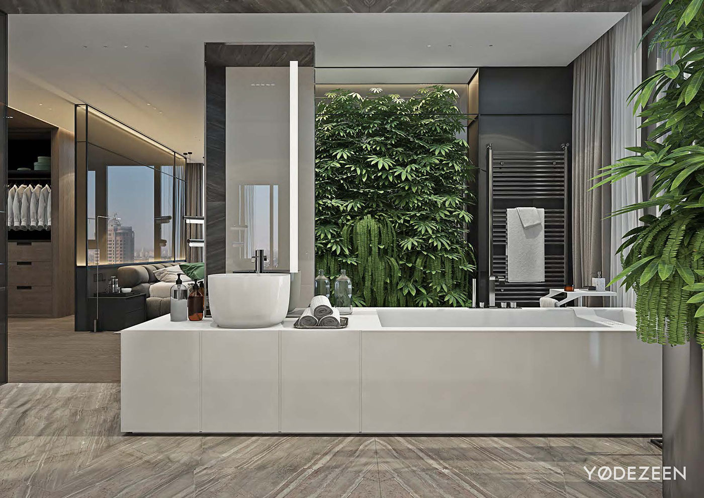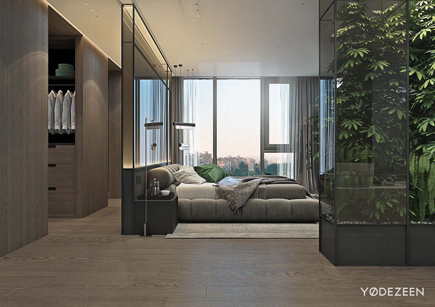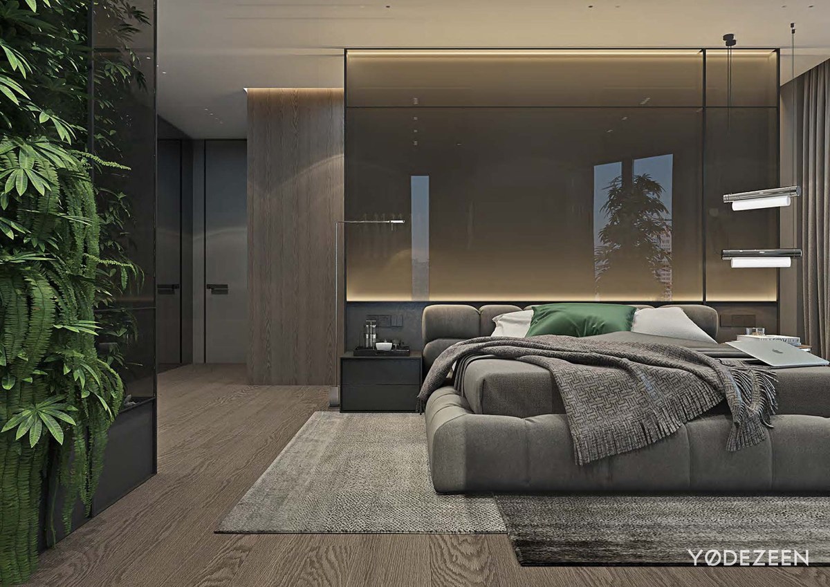 Toda habitación necesita un punto focal, que en este caso es la cama y el jardín vertical, pero también merece la pena mencionar la pared que separa la cama del armario. La parte superior de la pared es de cristal y está iluminada con LED. Es una pared de acento con clase que aporta profundidad y delicadeza.
