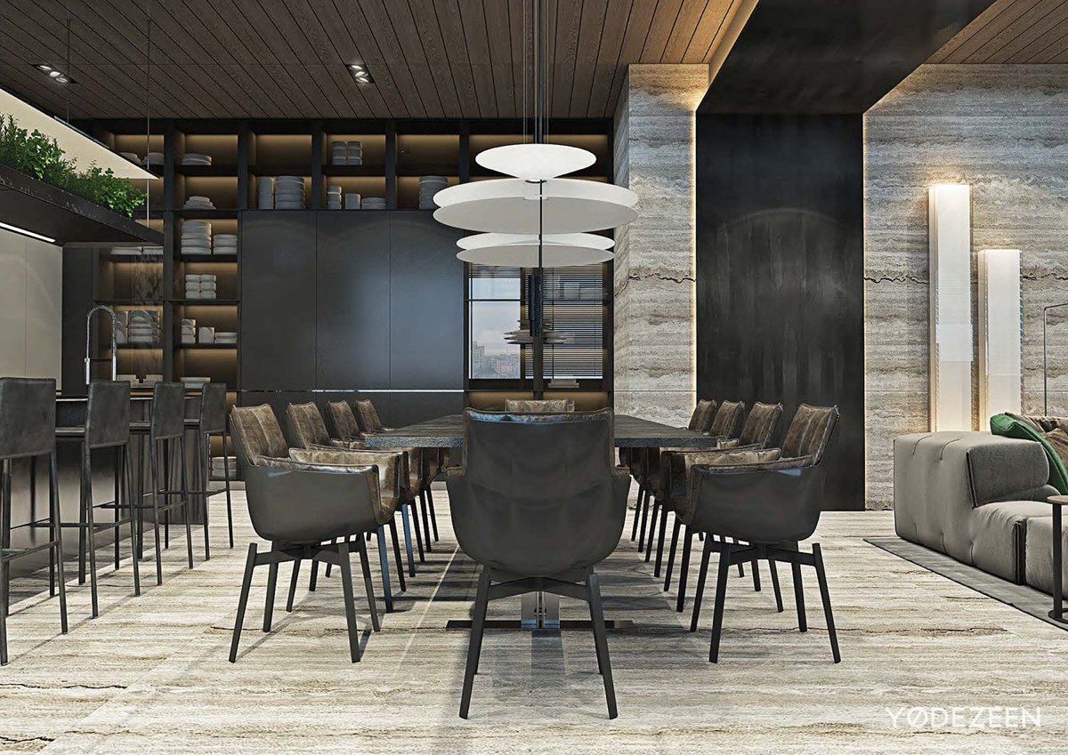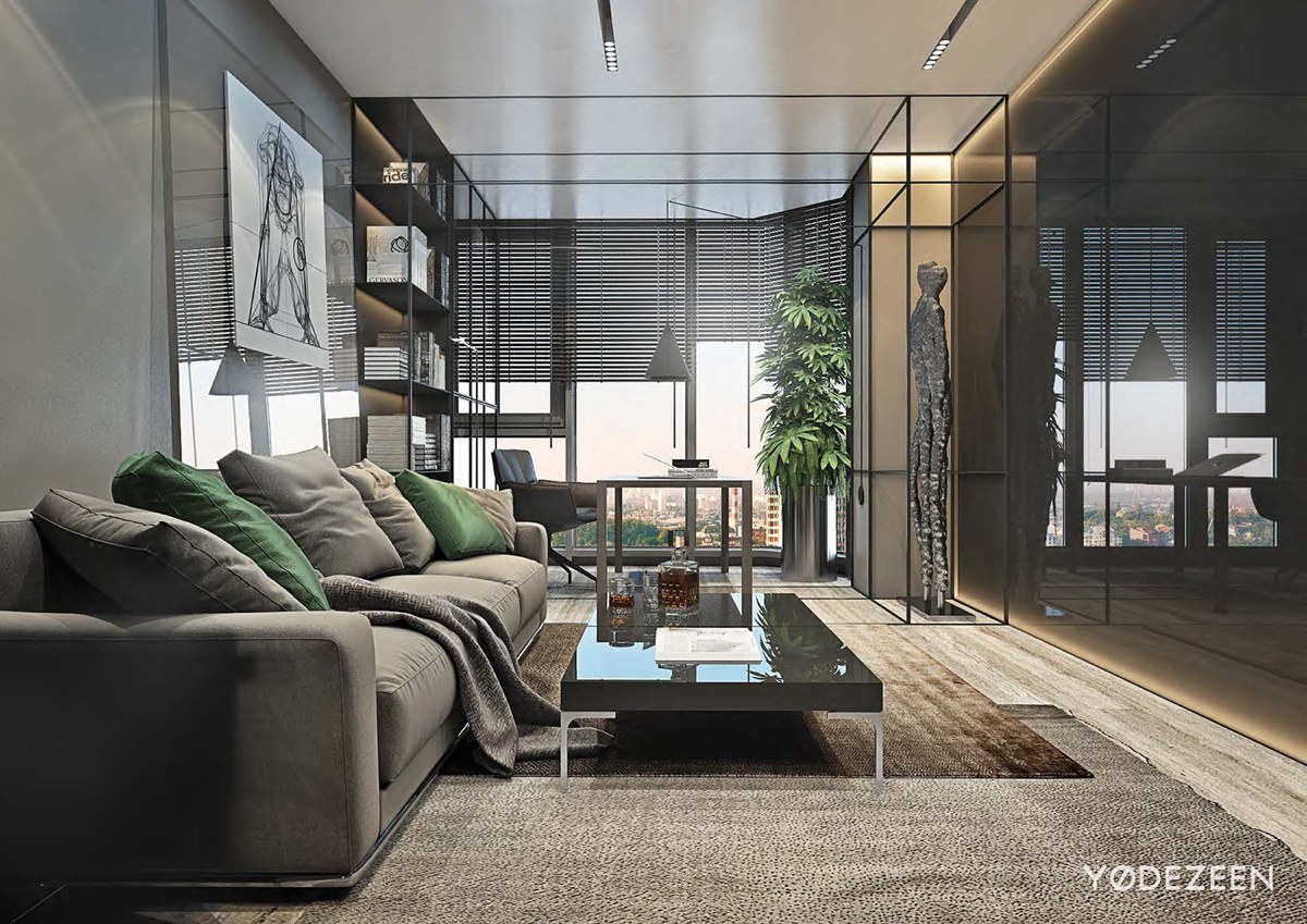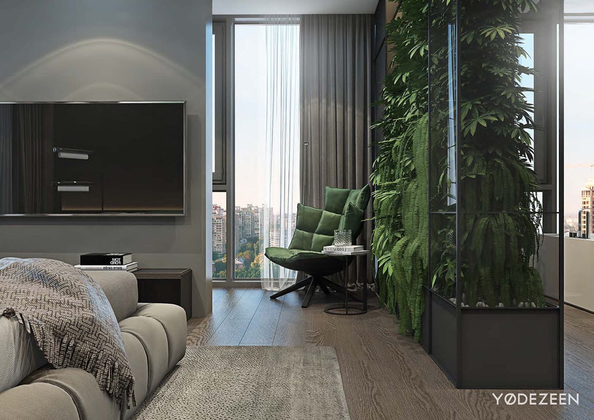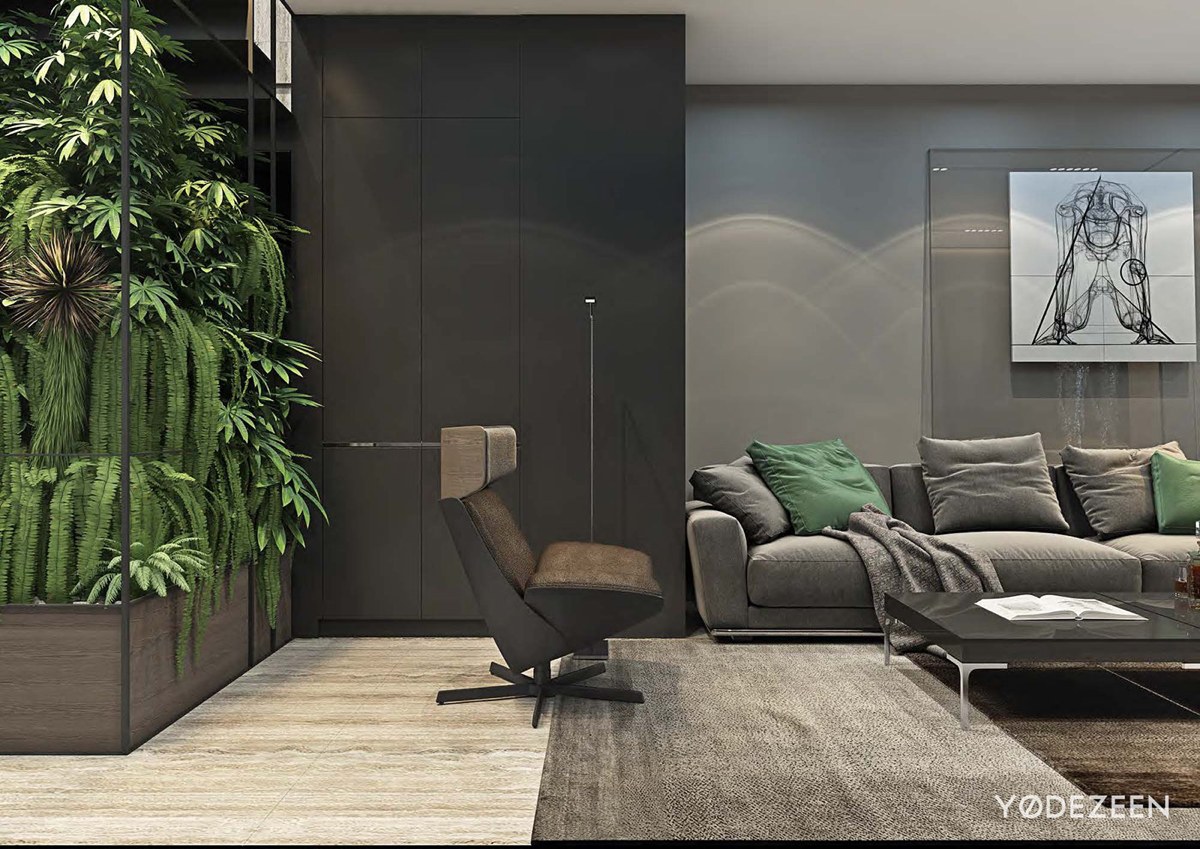 La abundancia de ventanas en el apartamento permitió a los diseñadores utilizar una paleta de colores monocromática y oscura. Para equilibrar los colores oscuros e intensos, se han añadido a la decoración piezas de acento luminosas, como los jardines verticales con plantas tropicales y las paredes de piedra clara. Los paneles de madera del techo caldean la zona, haciendo que el apartamento resulte más acogedor.