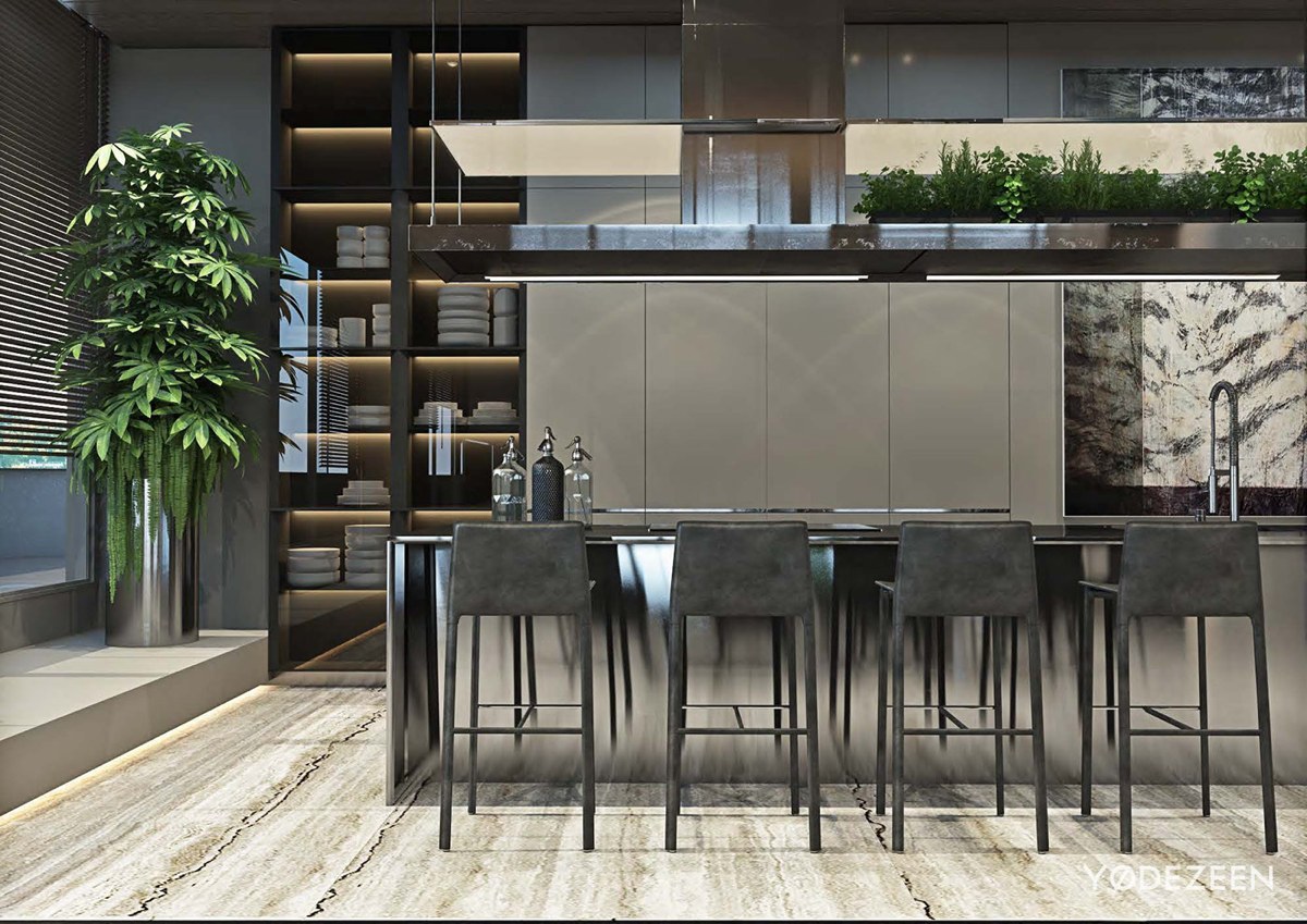 Un jardín de hierbas sobre la barra no sólo es estéticamente agradable, sino también funcional y creativo. El acabado material de los taburetes de bar aporta textura a la estancia, mientras que la superficie reflectante de la barra añade profundidad.