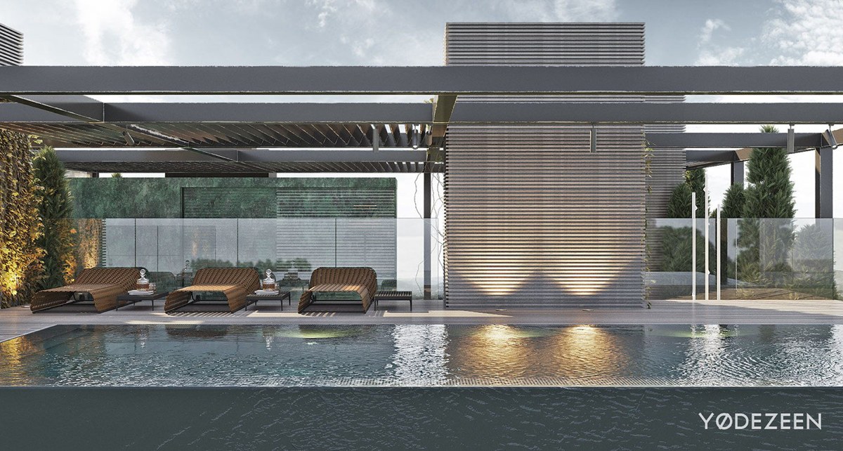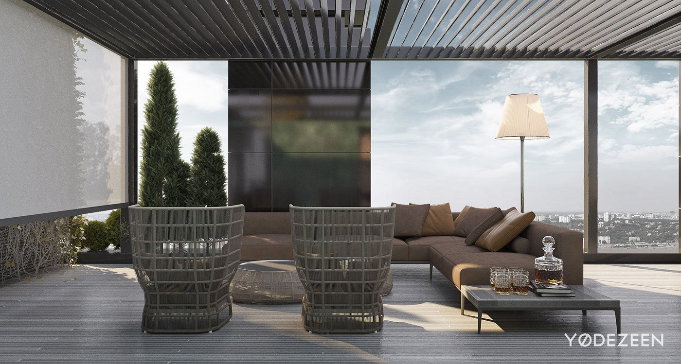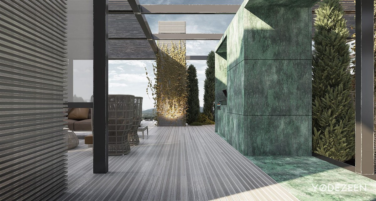 En el exterior, la terraza une la vivienda con el cielo. Los grandes ventanales convierten el cielo en un punto focal siempre cambiante. El exterior de la vivienda opta por una paleta de colores más natural. Las lamas que sobresalen pueden abrirse y cerrarse, manteniendo alejados los elementos.