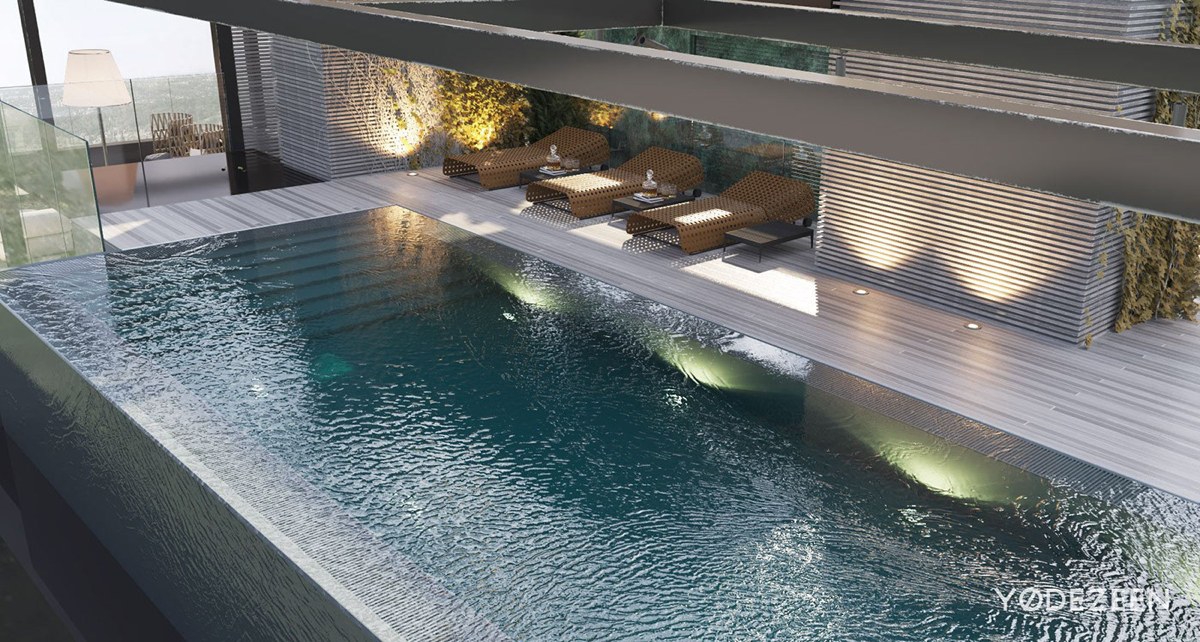 Las luces estratégicamente colocadas garantizan que la piscina pueda utilizarse tanto de día como de noche, mientras que la pared transparente de la piscina exige que los nadadores tengan un gran sentido de la aventura.