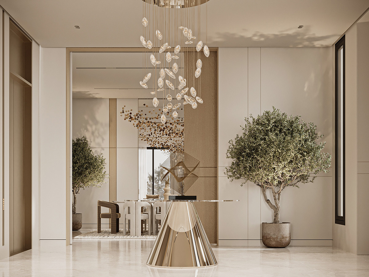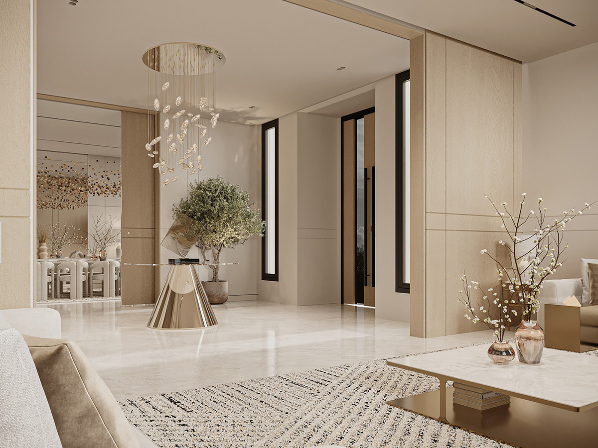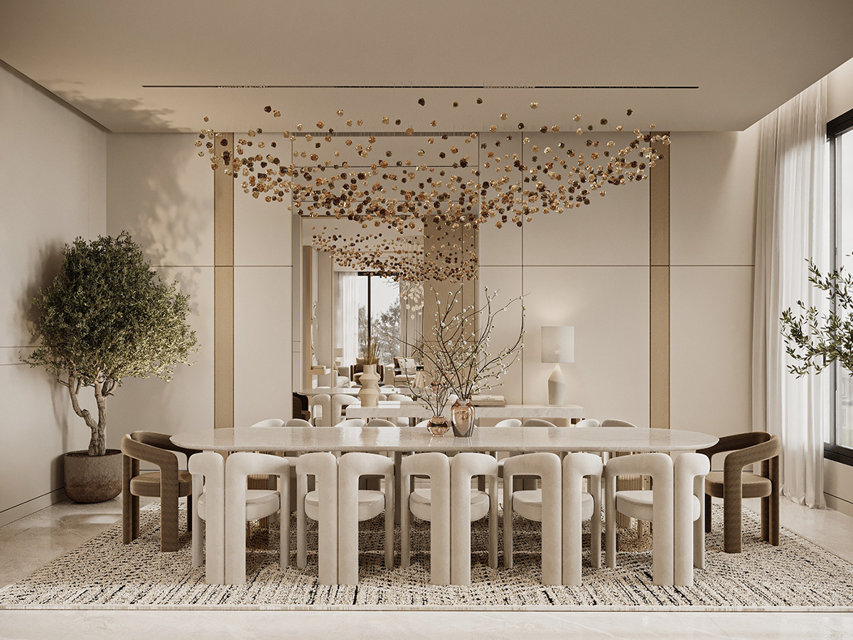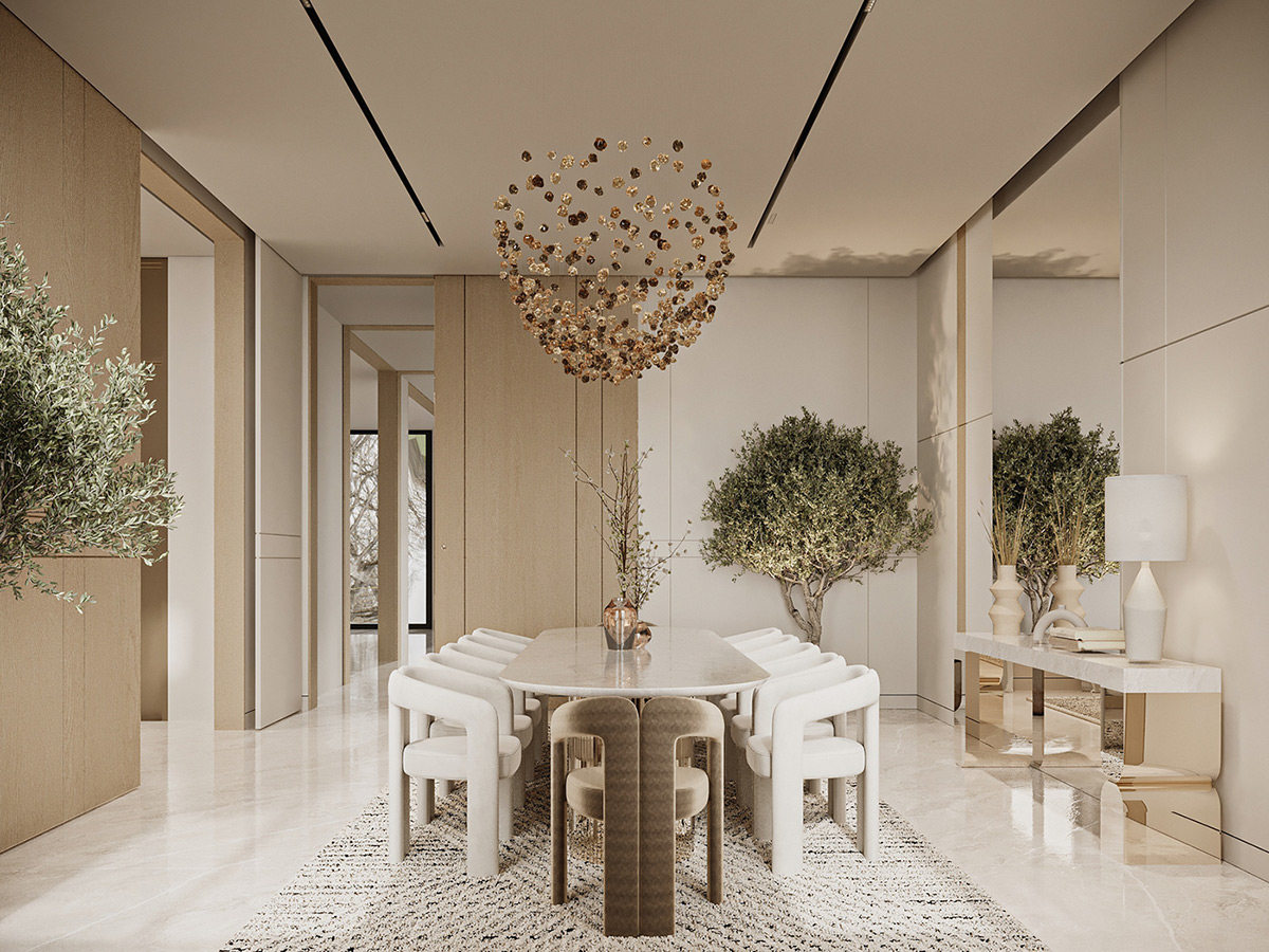 Esta impresionante villa en Arabia Saudí es la personificación del lujo tranquilo. Diseñados por Line X, los interiores presentan una serena paleta de tonos neutros que se combinan armoniosamente con elementos naturales como olivos y texturas orgánicas.