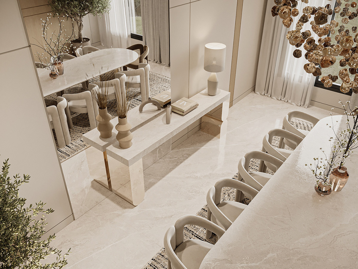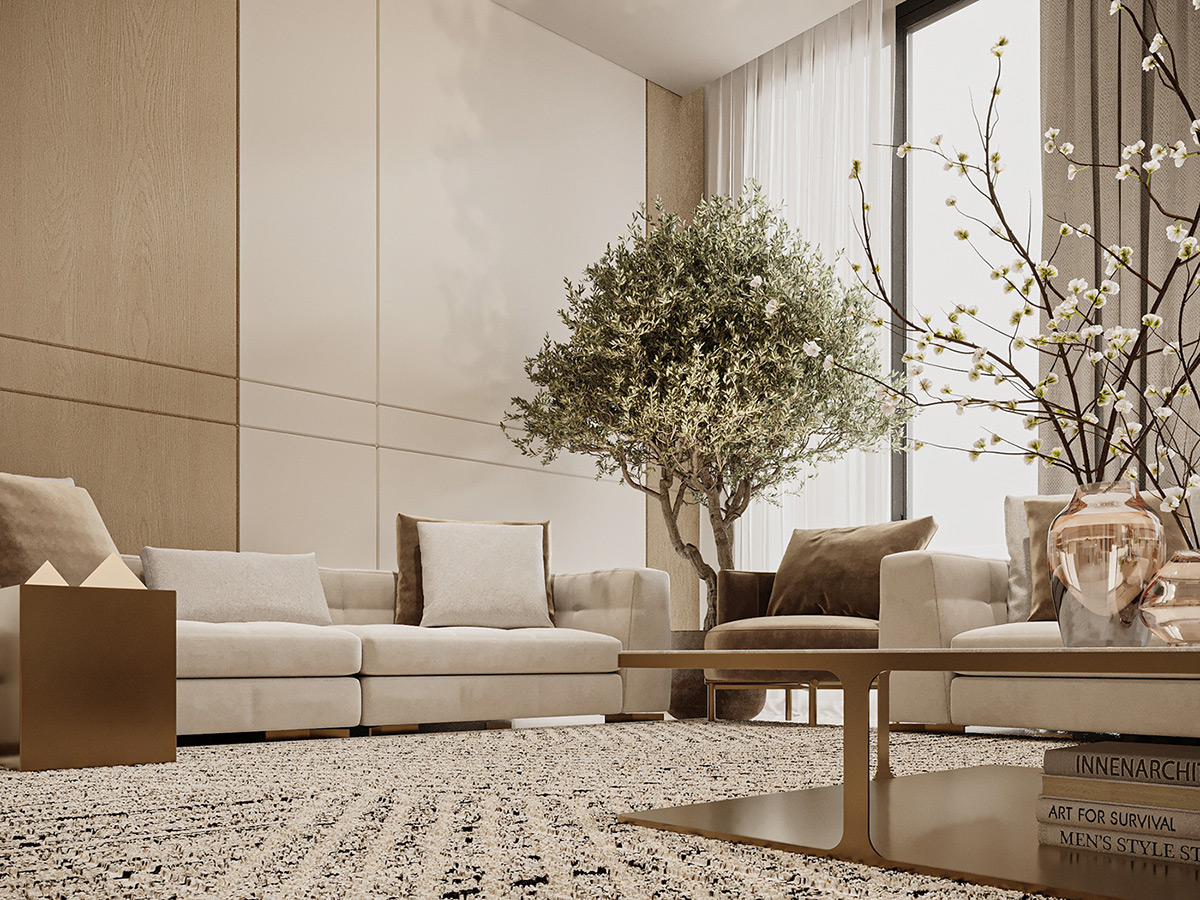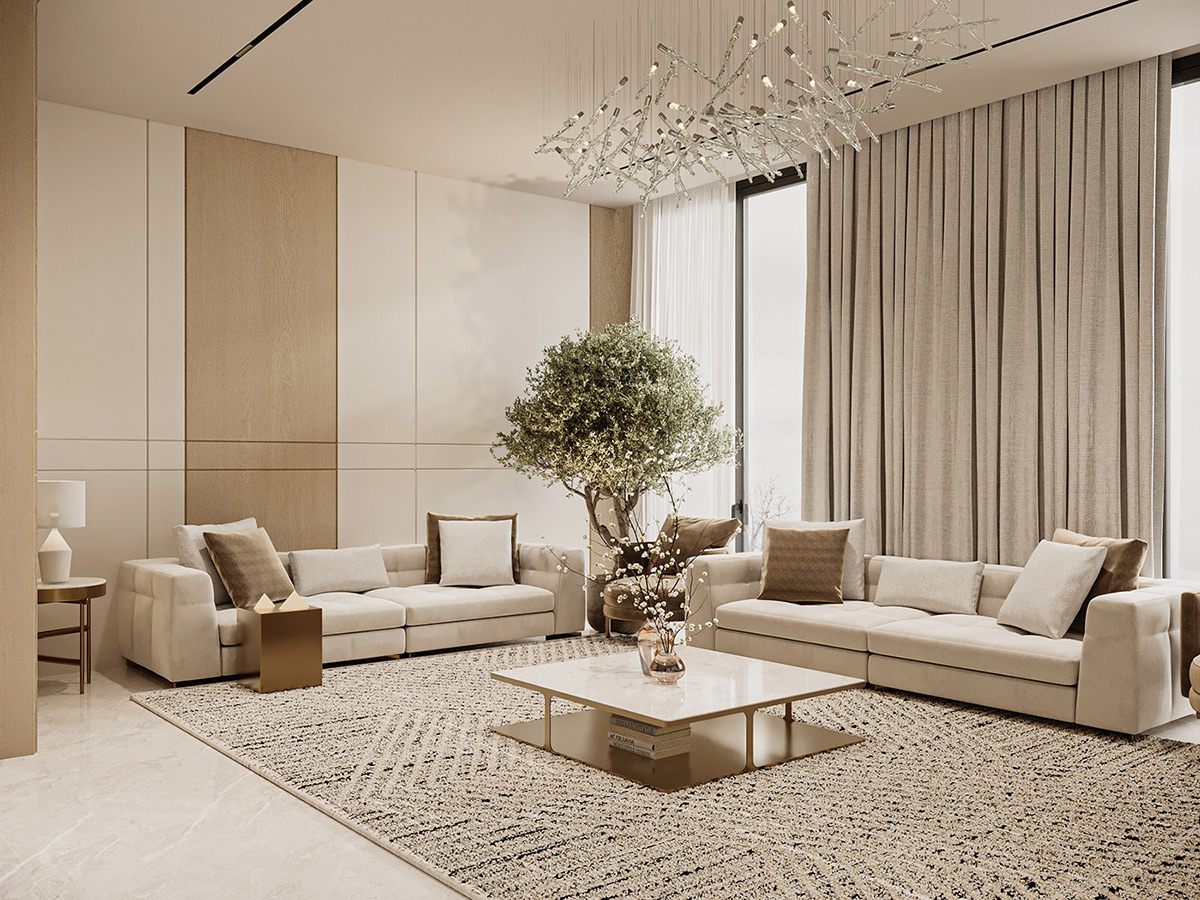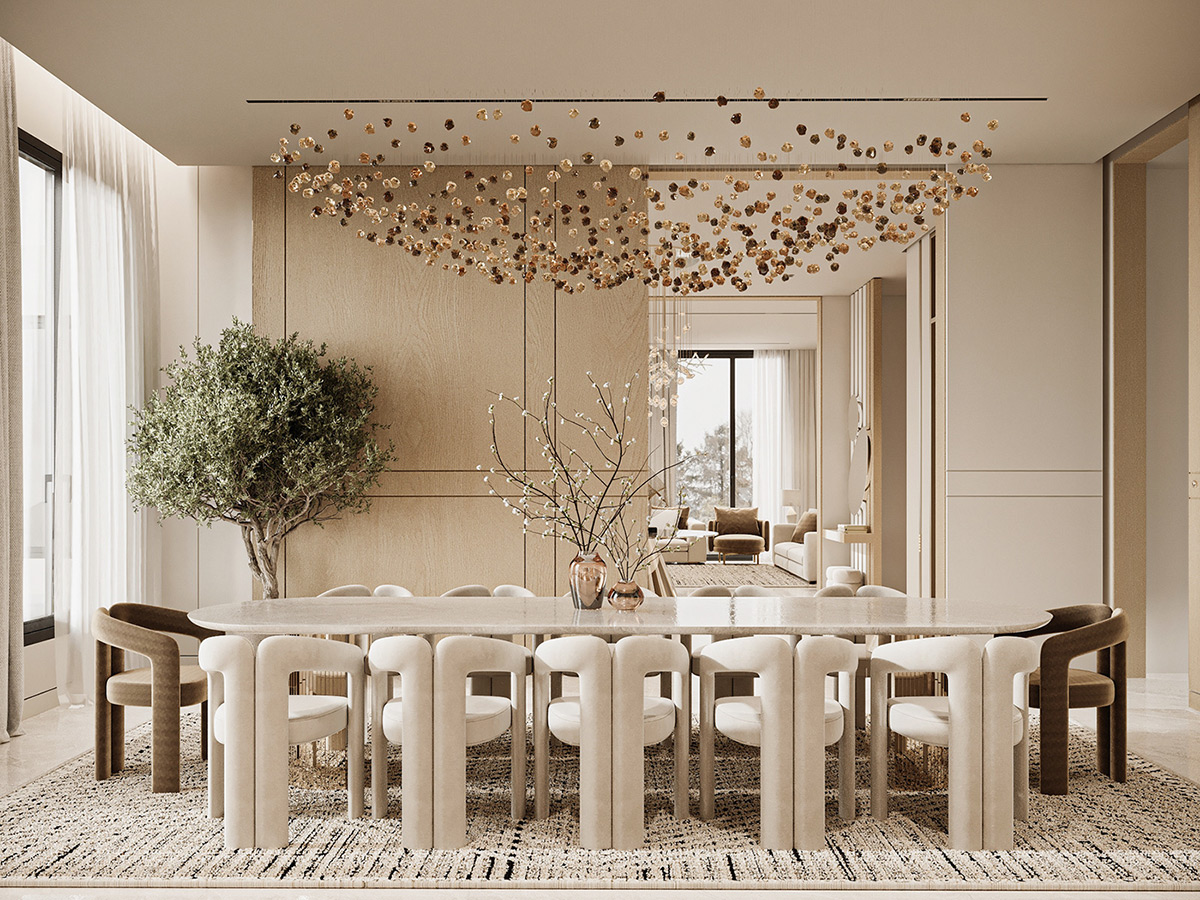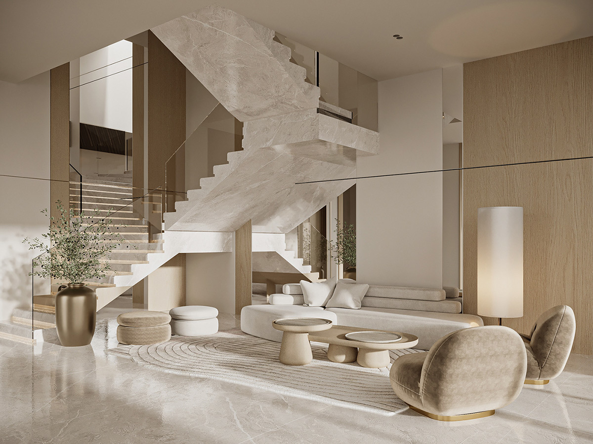 Esta impresionante villa en Arabia Saudí es la personificación del lujo tranquilo. Diseñados por Line X, los interiores presentan una serena paleta de tonos neutros que se combinan armoniosamente con elementos naturales como olivos y texturas orgánicas.