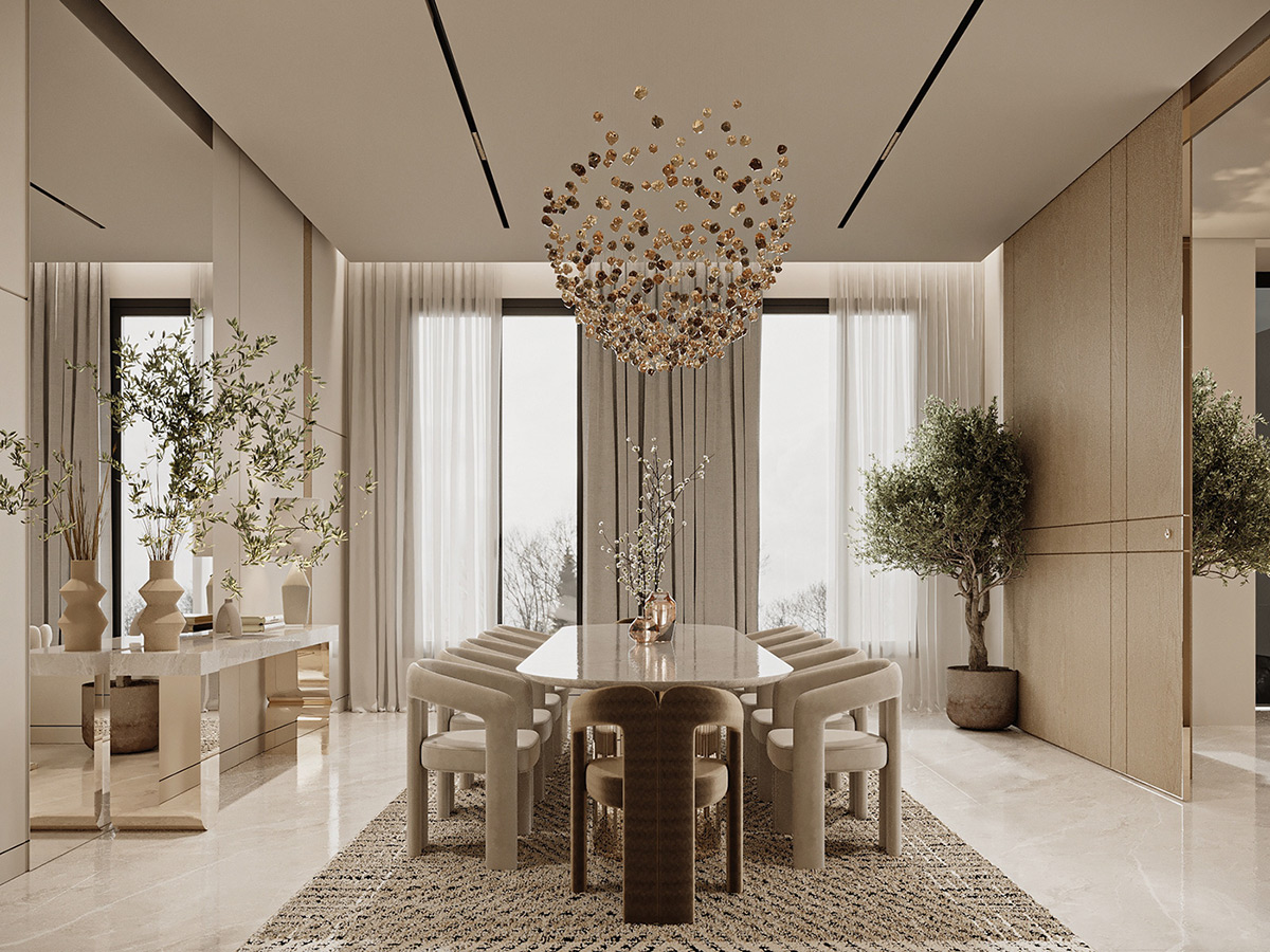 El mobiliario escultural y afelpado y los elegantes detalles dorados añaden un toque de opulencia sin sobrecargar la estética minimalista. Llamativas lámparas de araña iluminan los espacios, realzando el sofisticado encanto de la villa. Los grandes ventanales dejan entrar abundante luz natural, creando un ambiente aireado y acogedor.