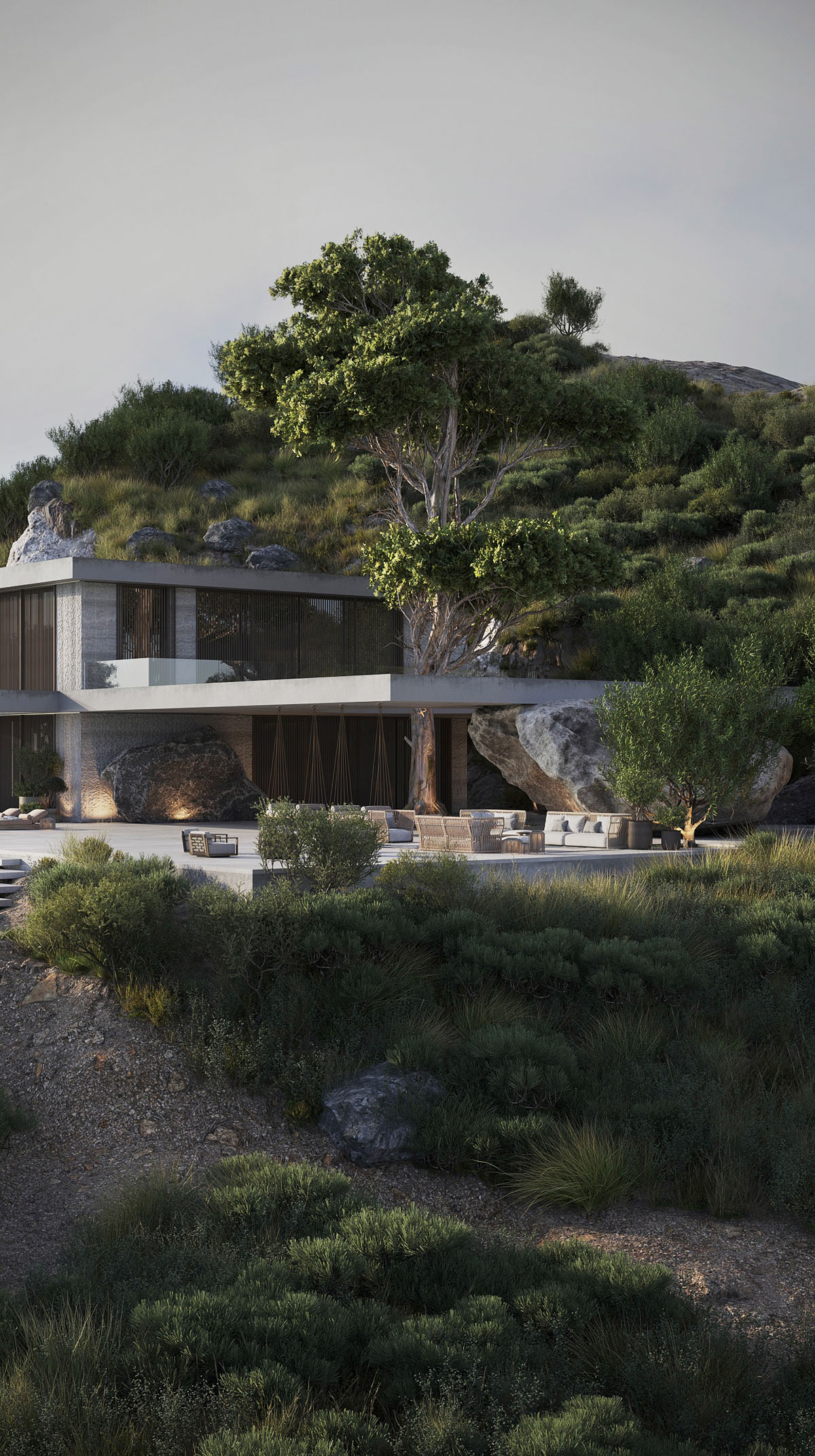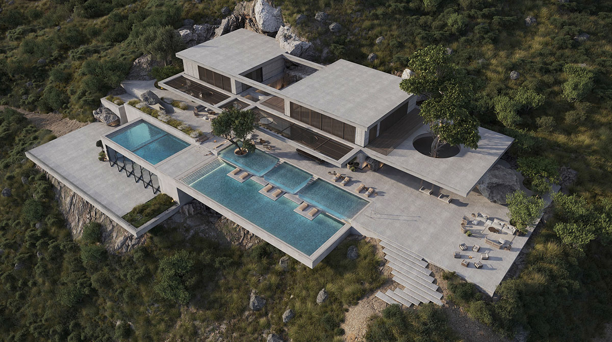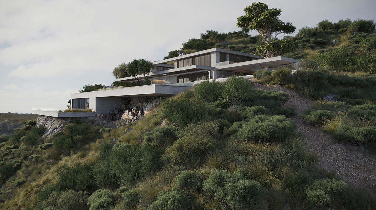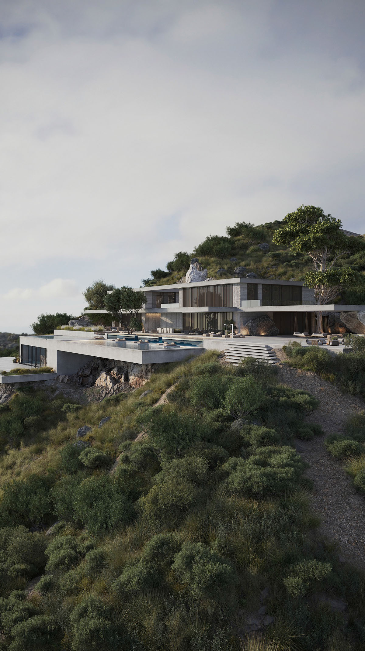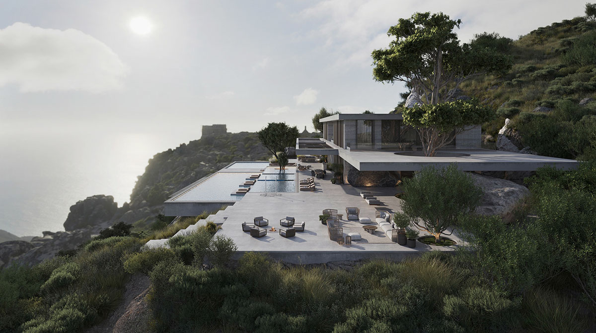 La afilada arquitectura de hormigón y las terrazas de la piscina se adentran en un terreno de ladera escarpada, donde largas hierbas ondulan con la brisa y enormes rocas surgen de la superficie rocosa.