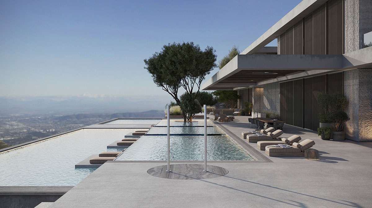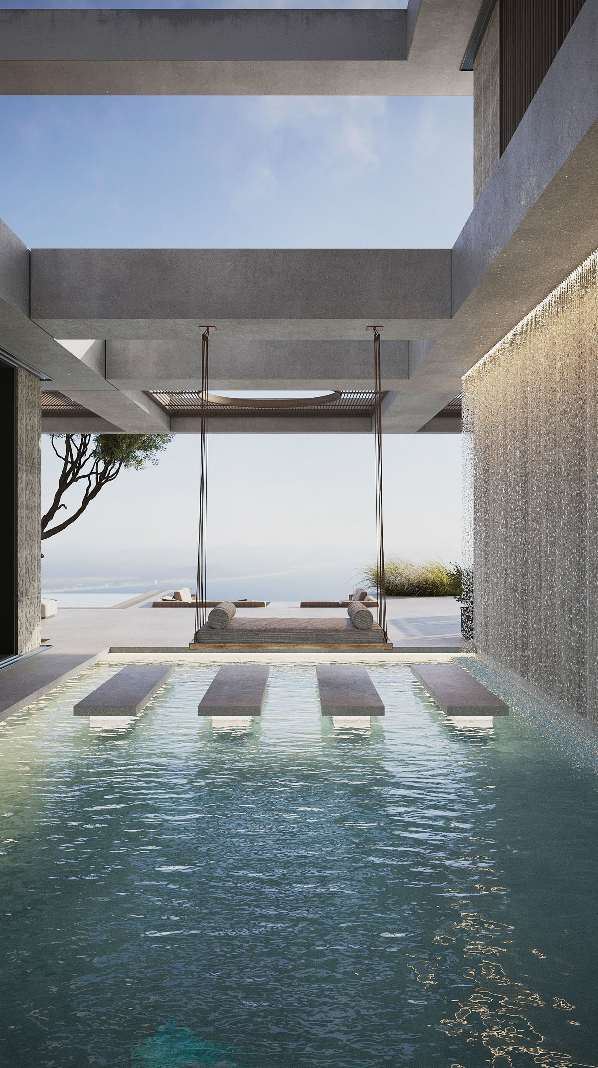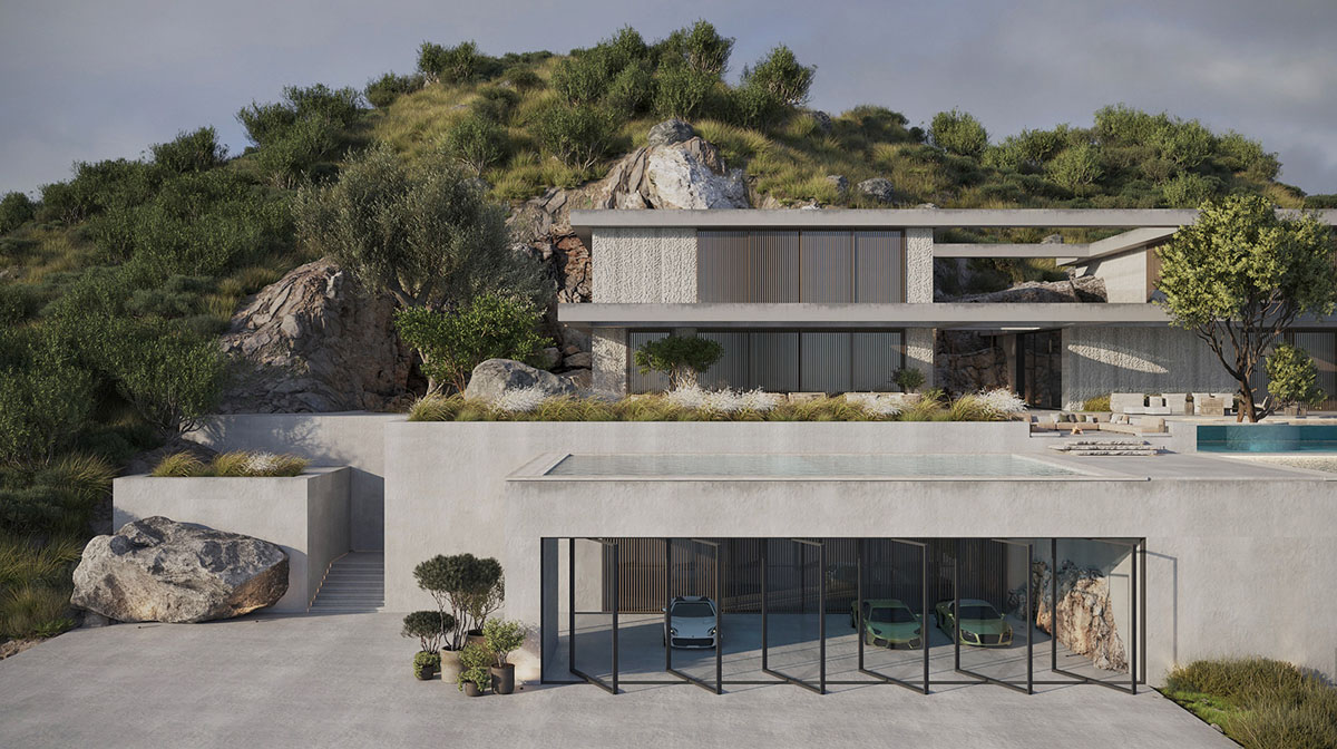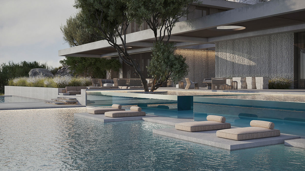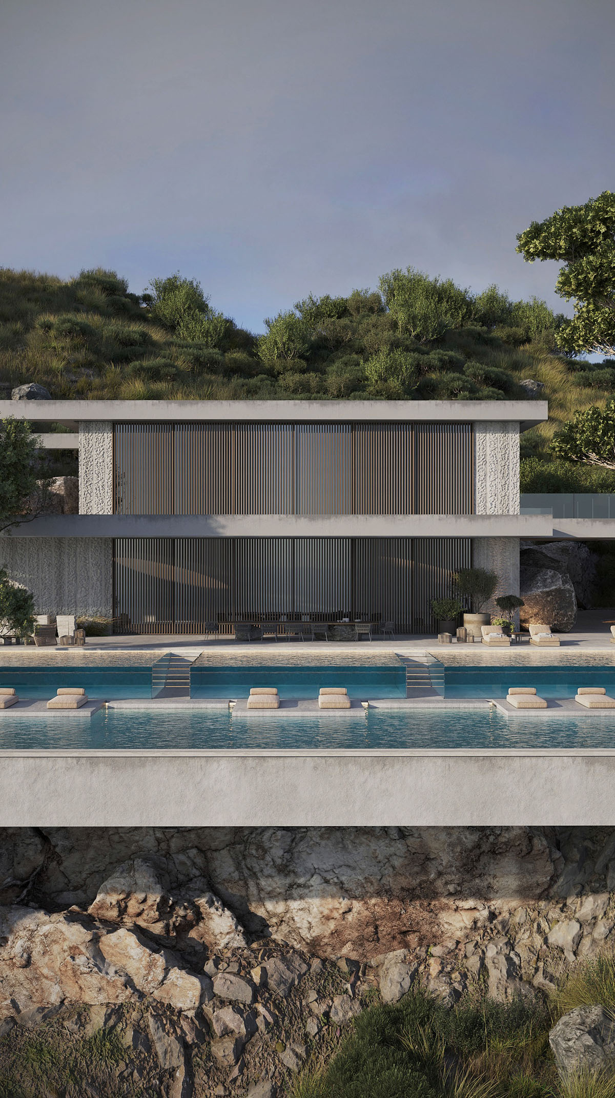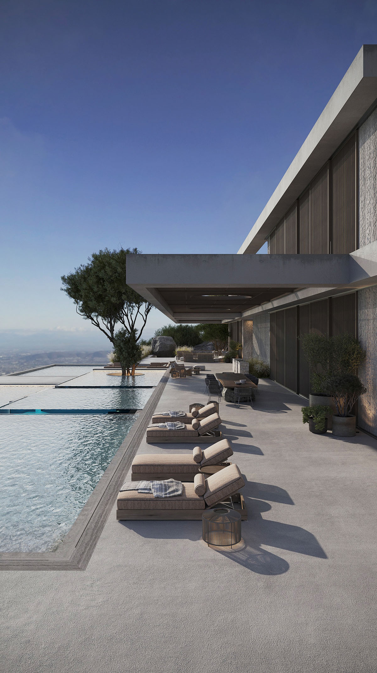 La afilada arquitectura de hormigón y las terrazas de la piscina se adentran en un terreno de ladera escarpada, donde largas hierbas ondulan con la brisa y enormes rocas surgen de la superficie rocosa.