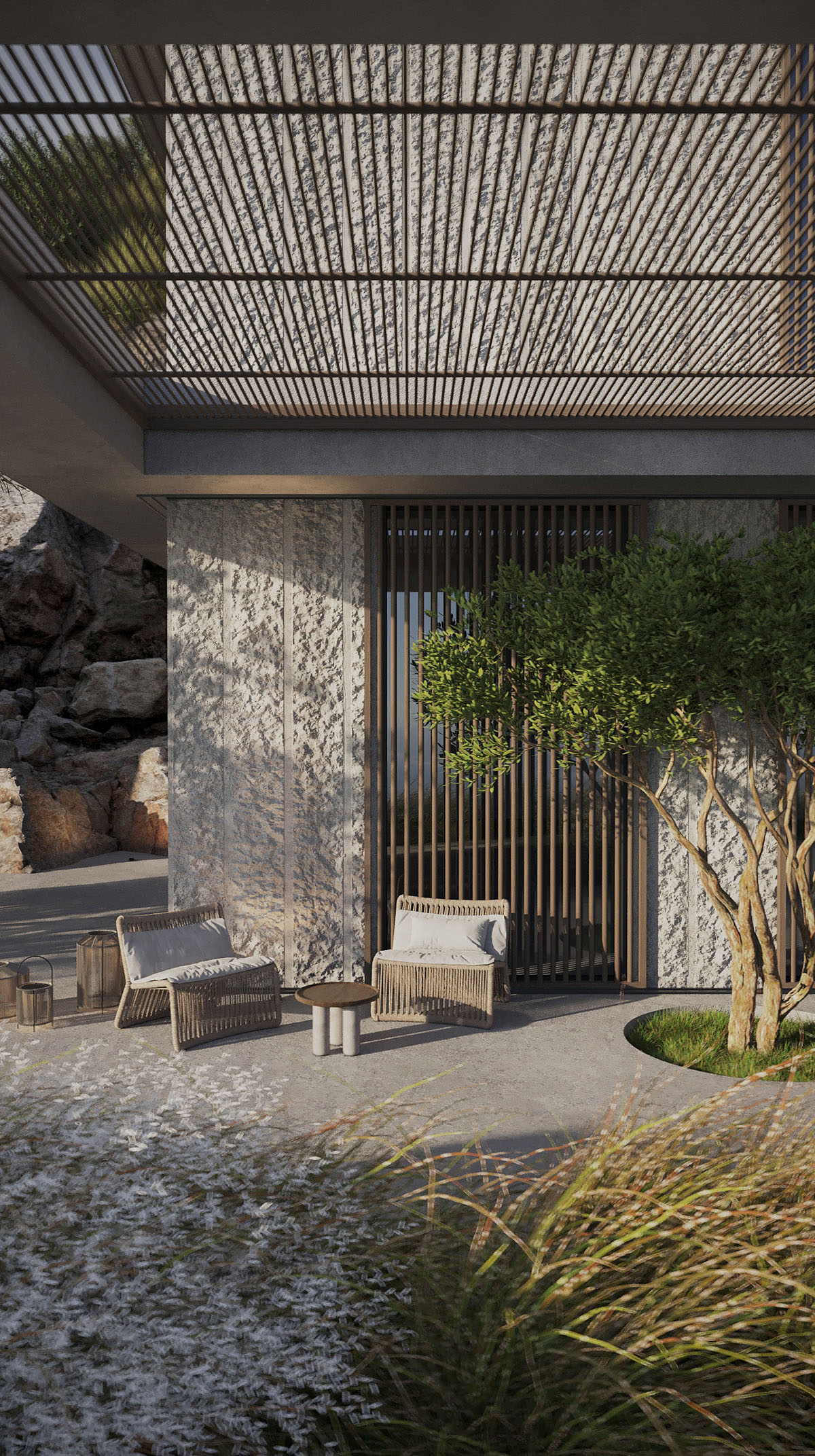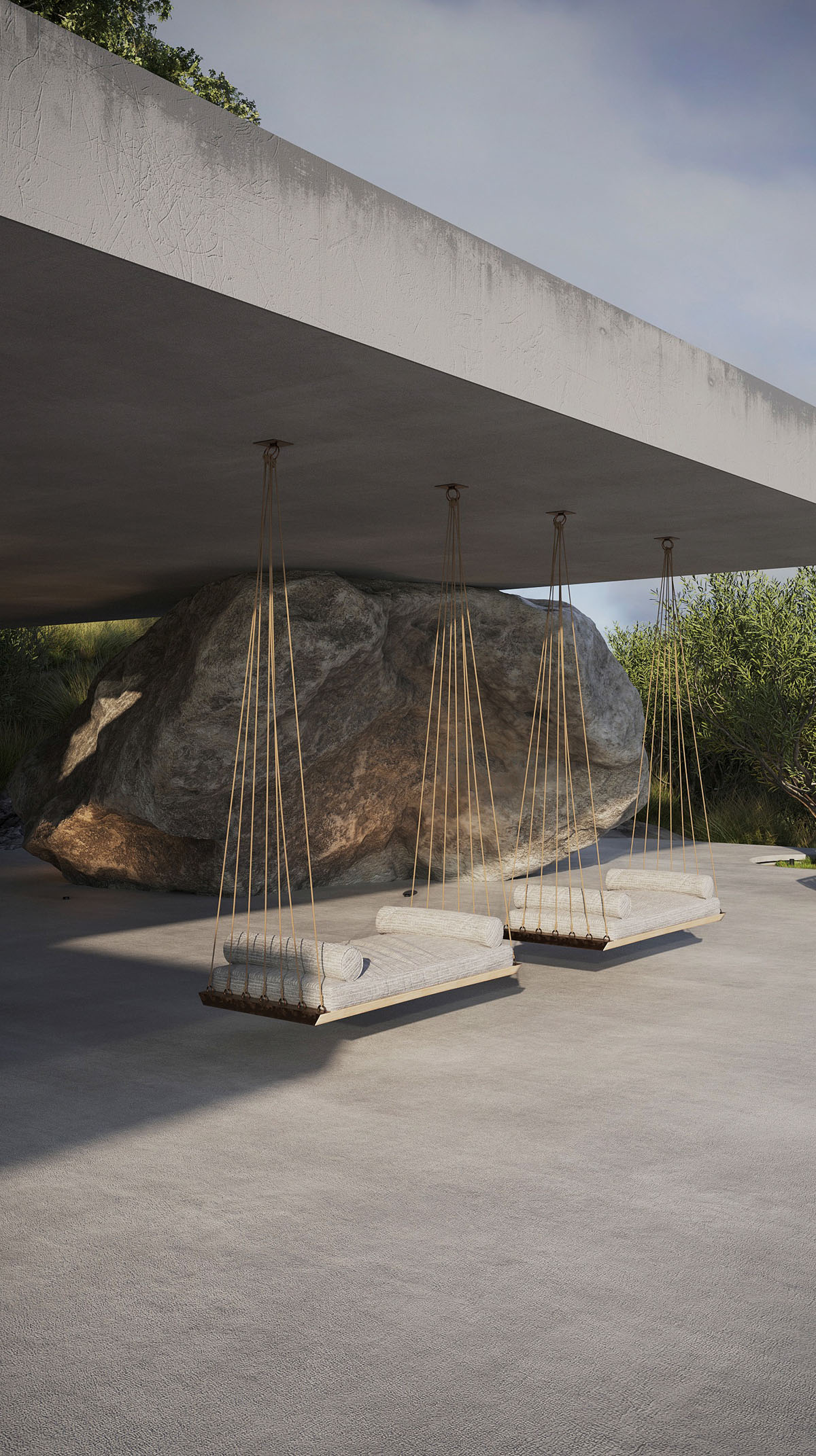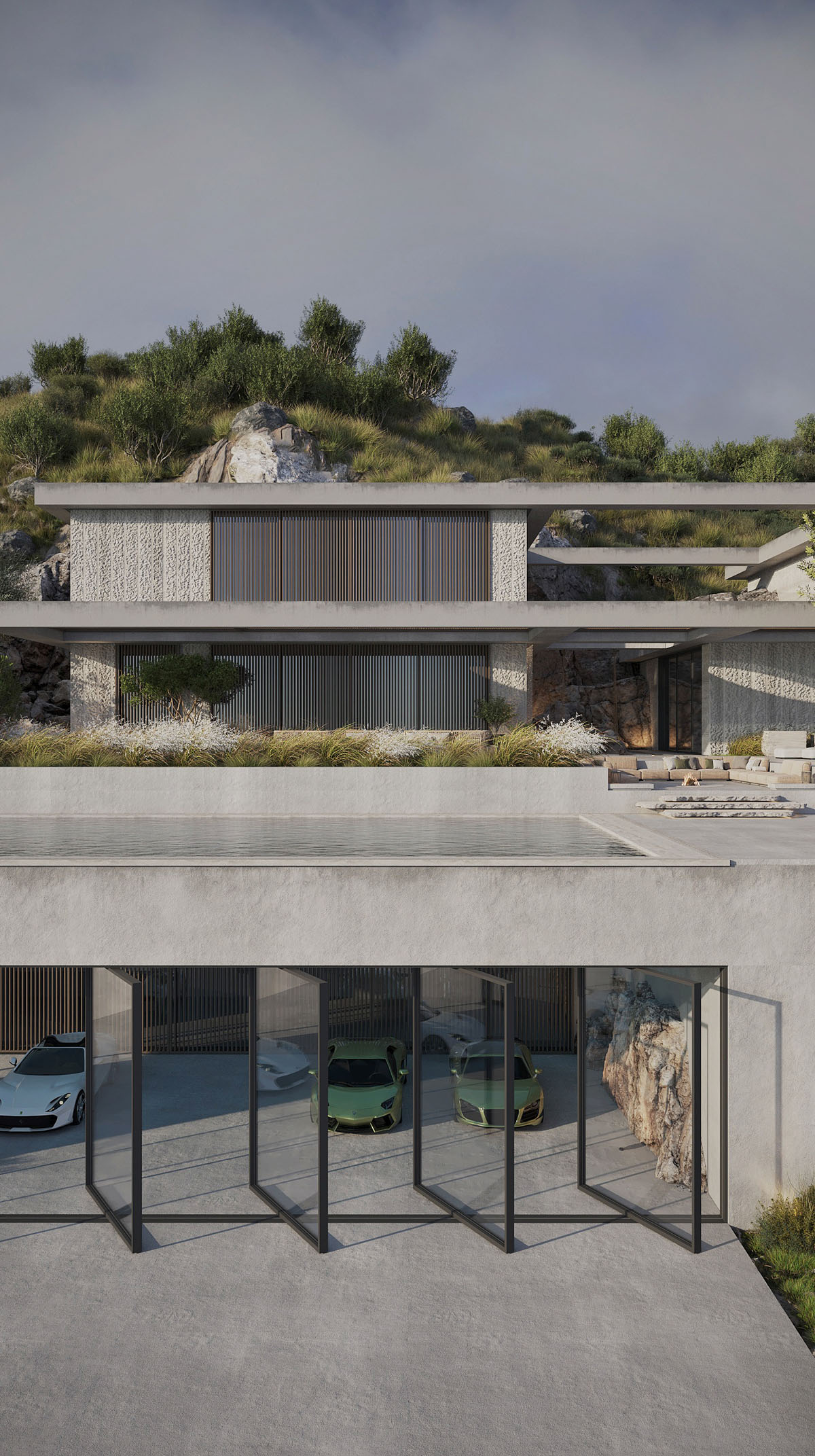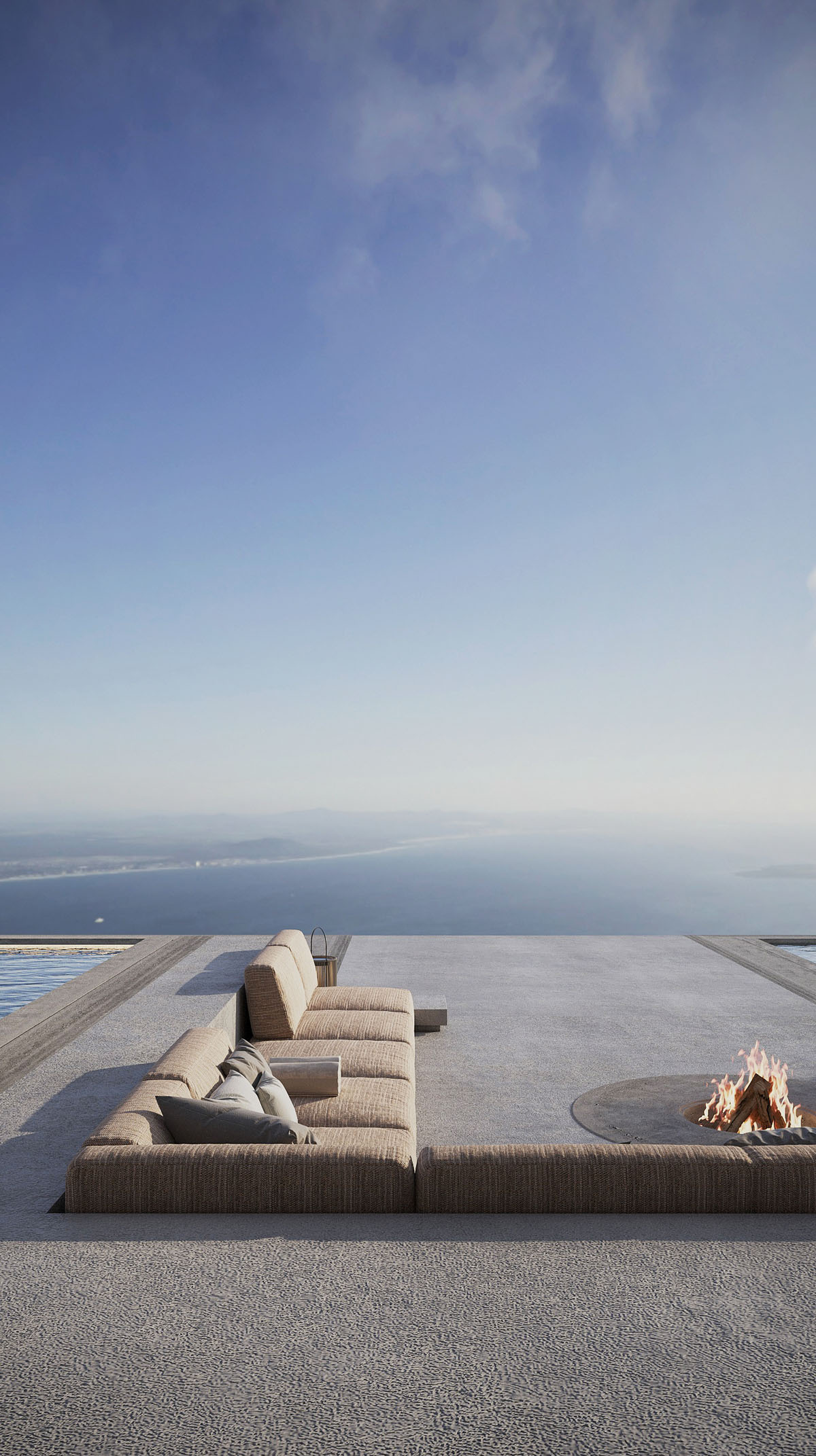 La afilada arquitectura de hormigón y las terrazas de la piscina se adentran en un terreno de ladera escarpada, donde largas hierbas ondulan con la brisa y enormes rocas surgen de la superficie rocosa.