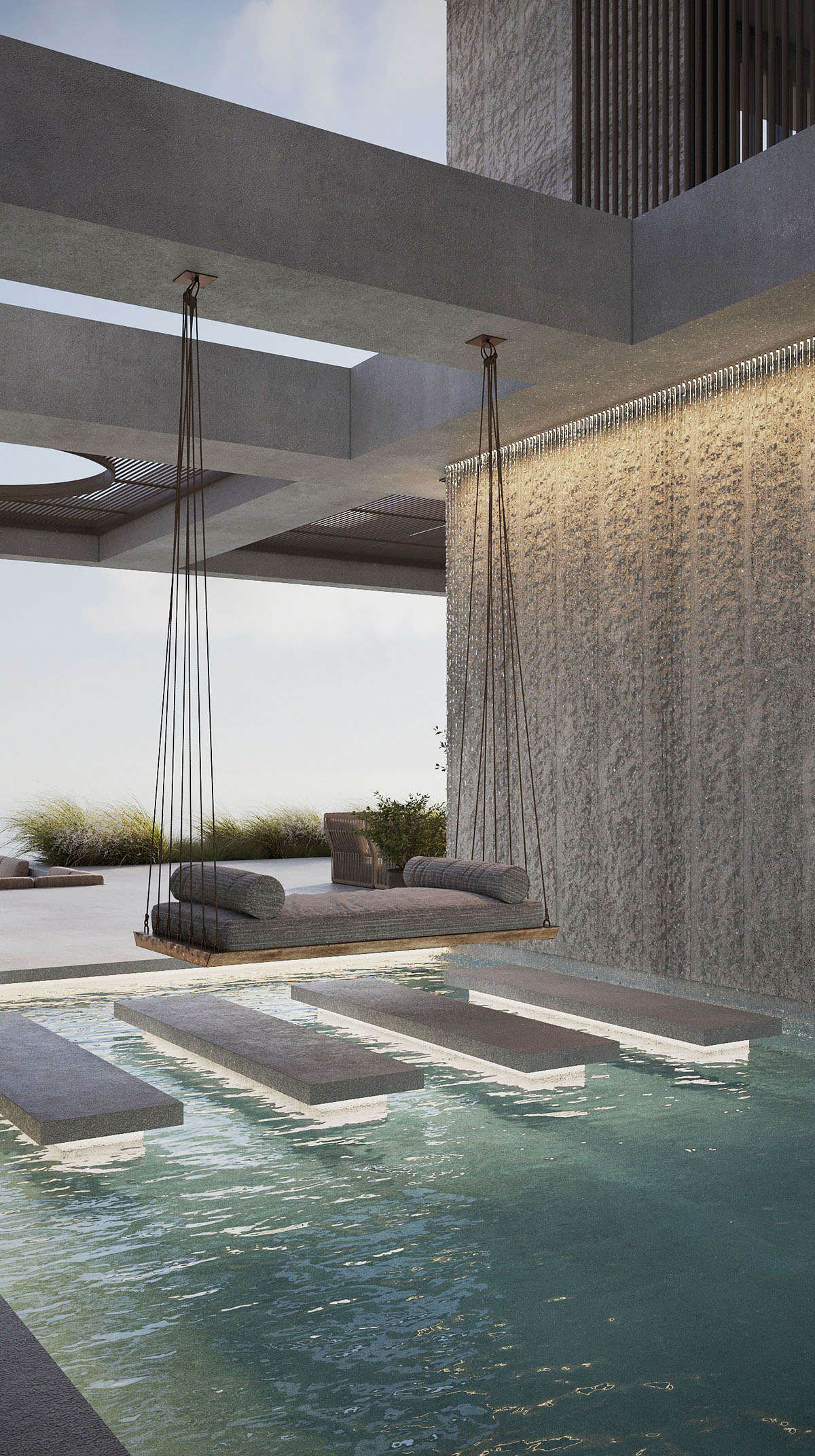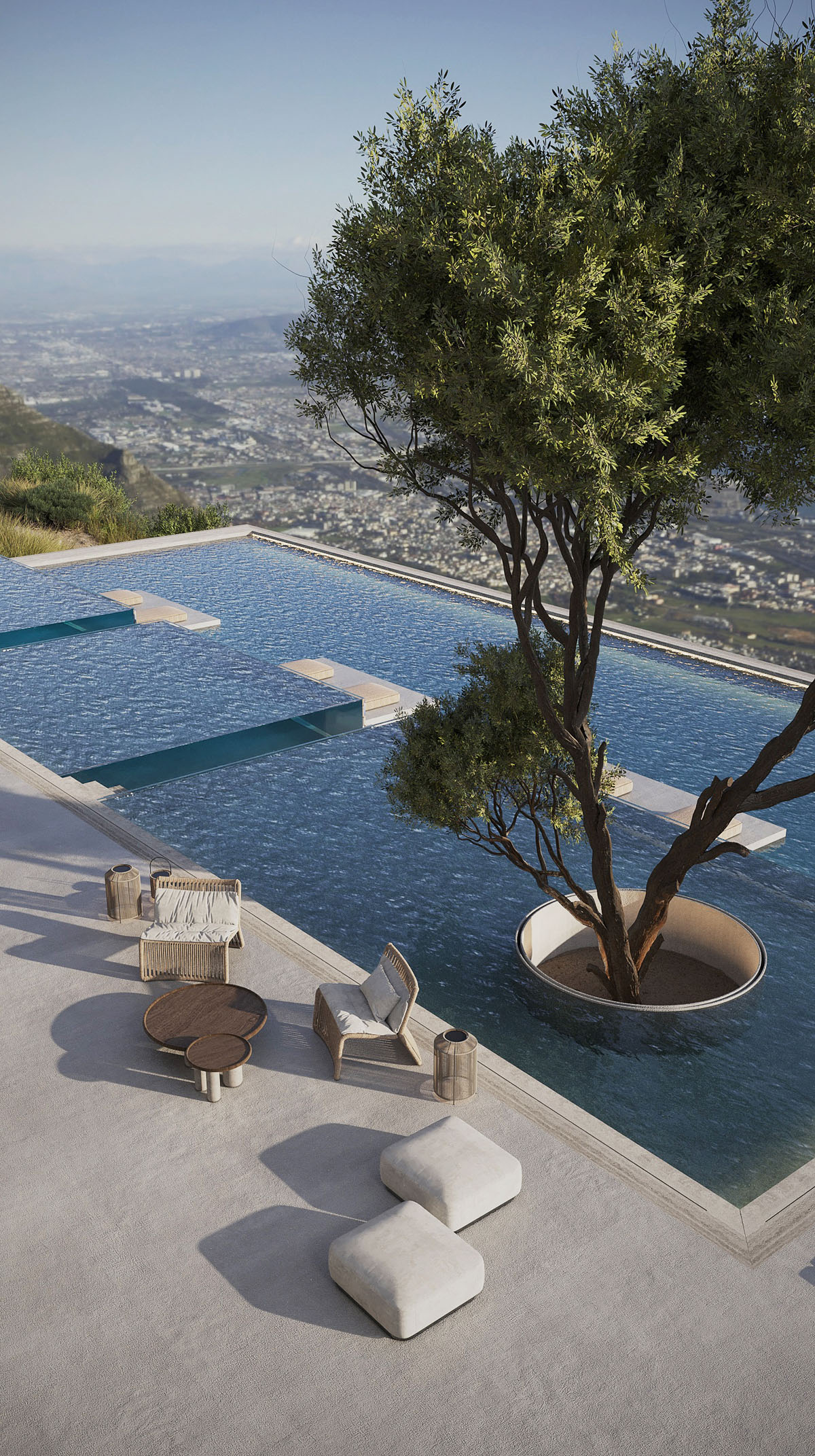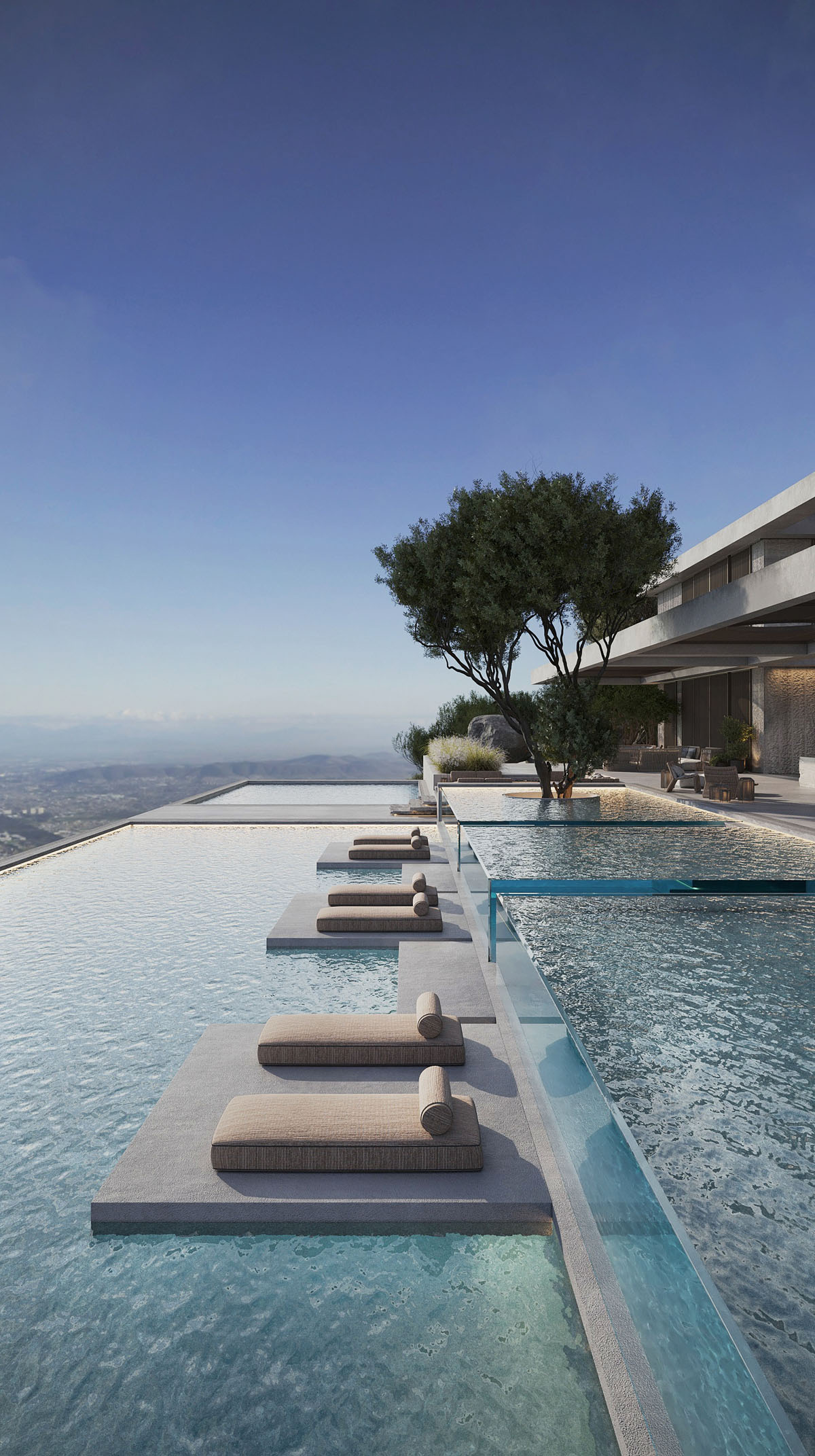 Visualizado por NK Interior, este diseño ofrece una perfecta integración de belleza y funcionalidad, dando como resultado un santuario exterior realmente cautivador. Alrededor de las amplias terrazas y las piscinas escalonadas se crean vistas únicas.
