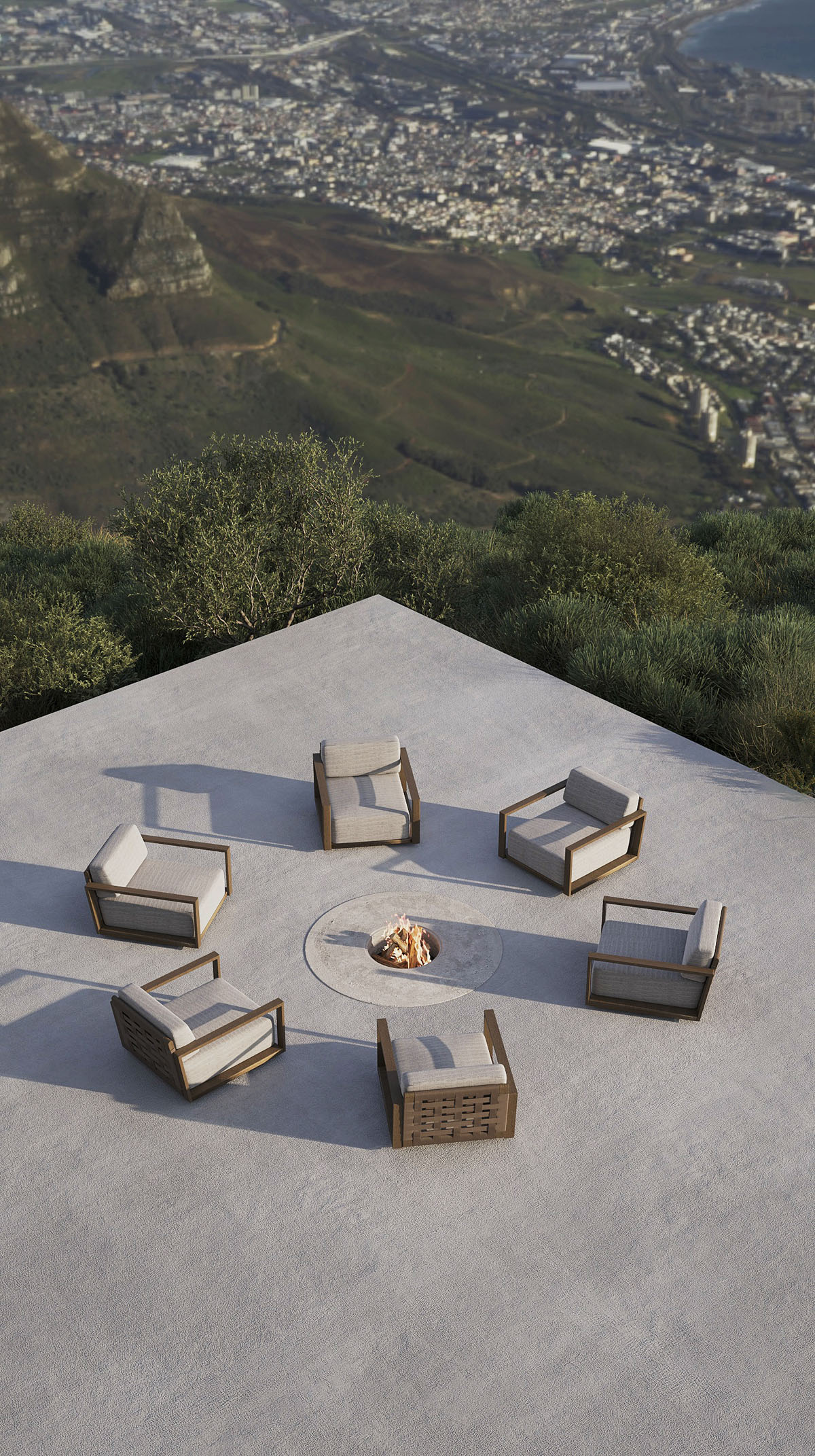 Seis modernas sillas de exterior se reúnen en torno a una hoguera en el borde de la terraza solárium de hormigón, que se abre sin límites a las vistas que hay más allá.