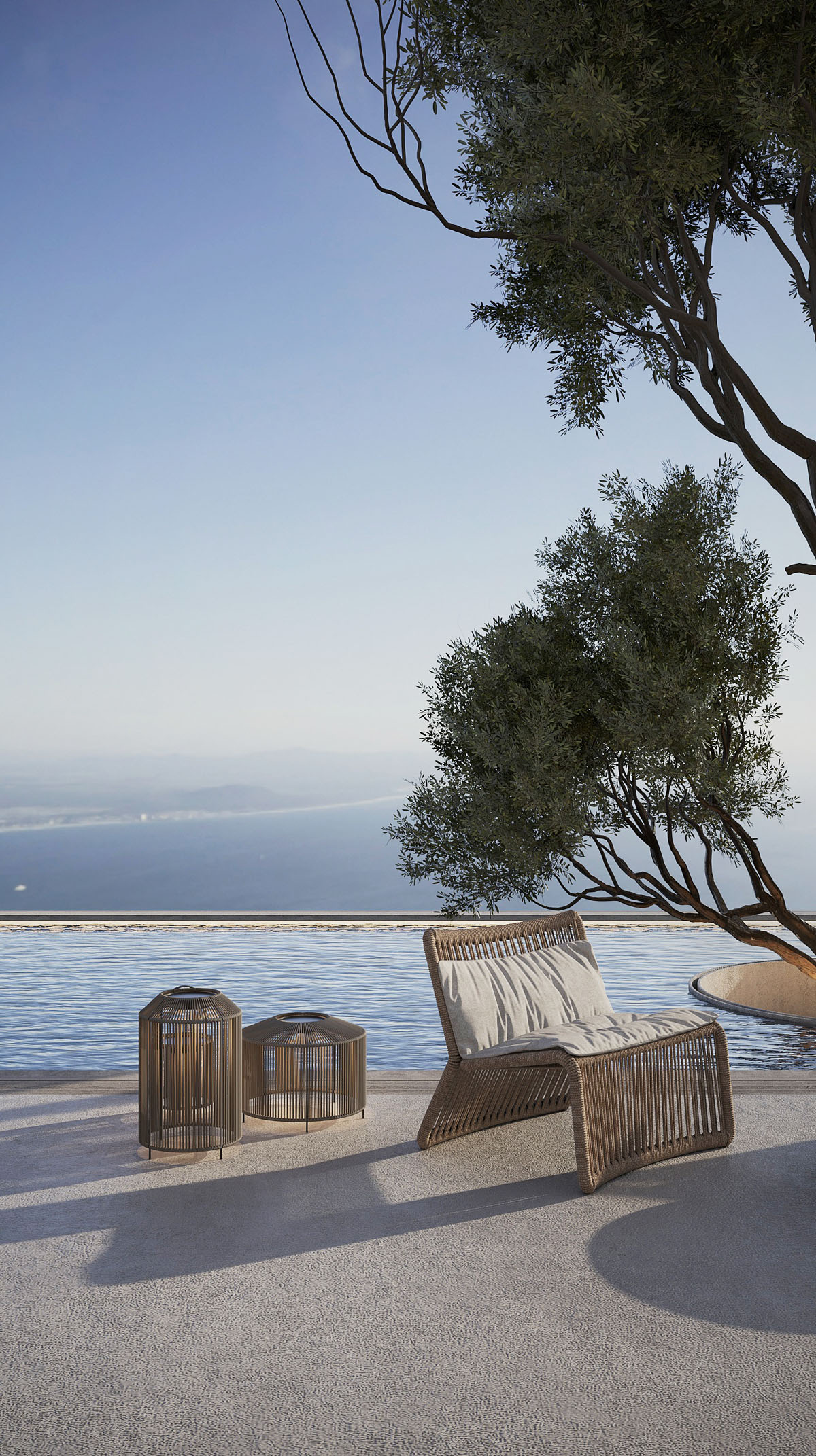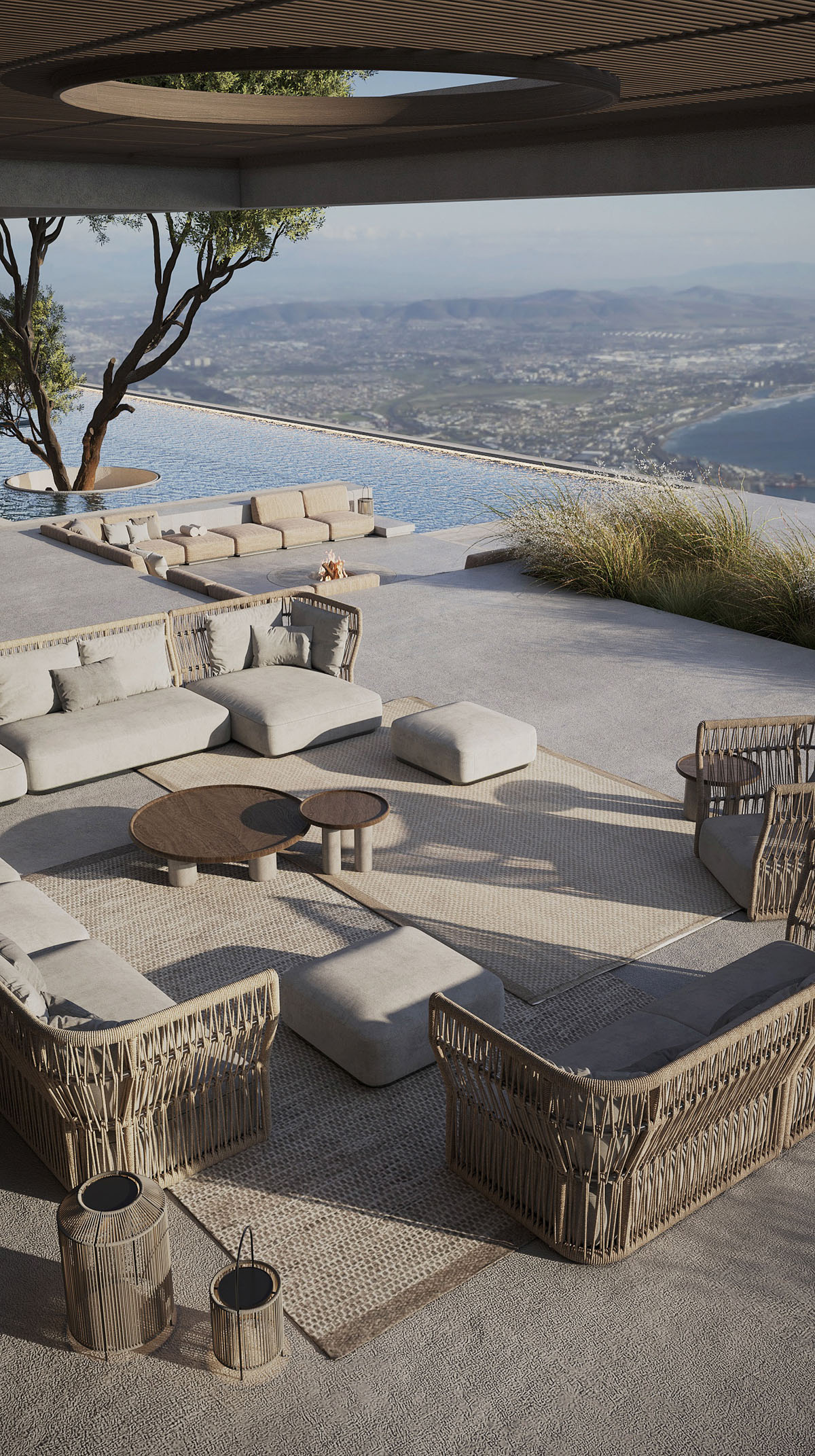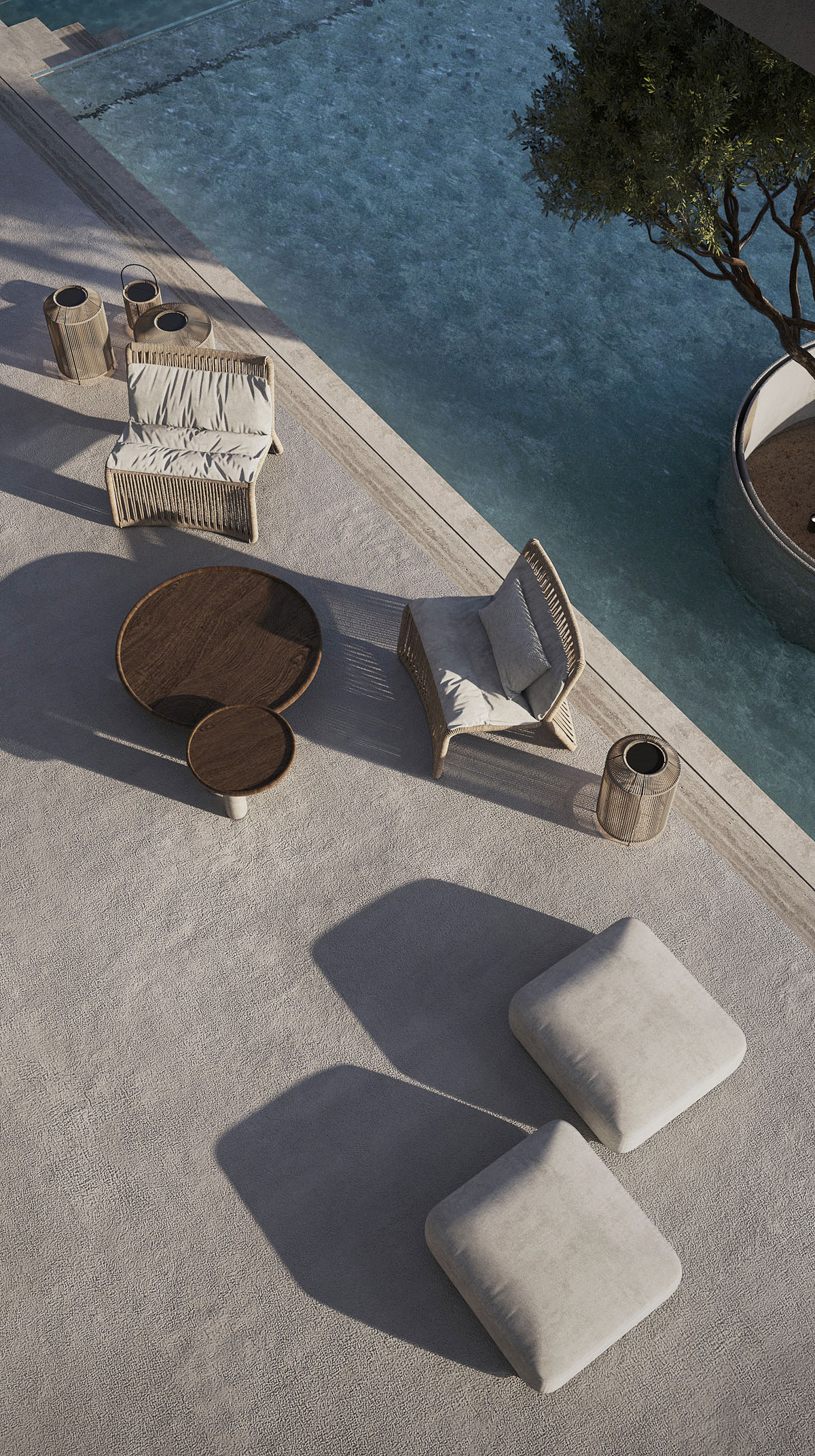 Los pufs de exterior se pueden recoger y desplazar por los distintos asientos o junto a la piscina para adaptarse a los cambios de necesidades y conversaciones. Las alfombras de exterior se superponen para crear una acogedora estética interior-exterior.