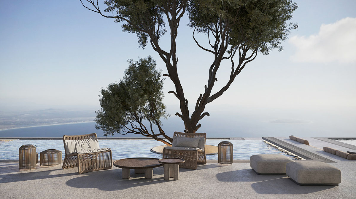 Modernas tumbonas se alinean a lo largo de la terraza, perfectamente situadas para contemplar el vasto panorama.
