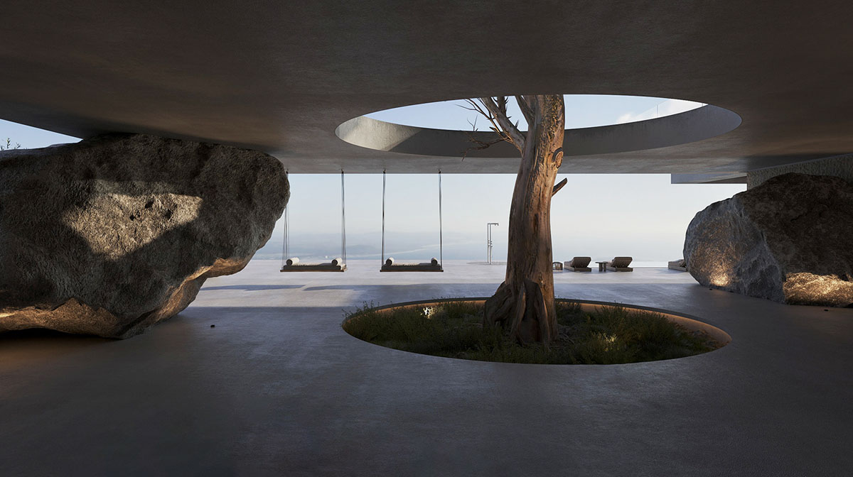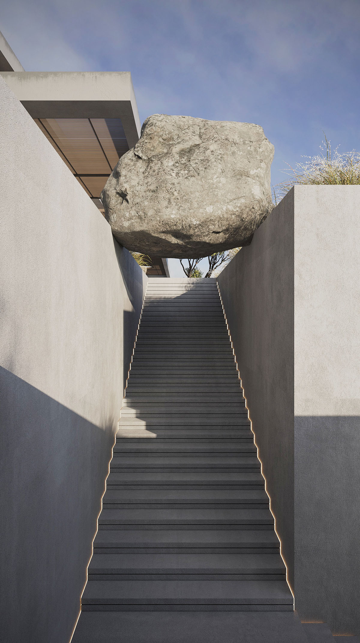 Una enorme roca sostiene la esquina del voladizo de hormigón, creando un elemento de diseño único y robusto.