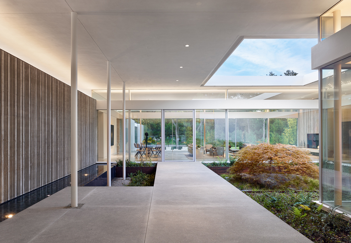 El estrecho canal de agua forma una conexión continua desde el patio de entrada hasta la terraza ajardinada trasera.