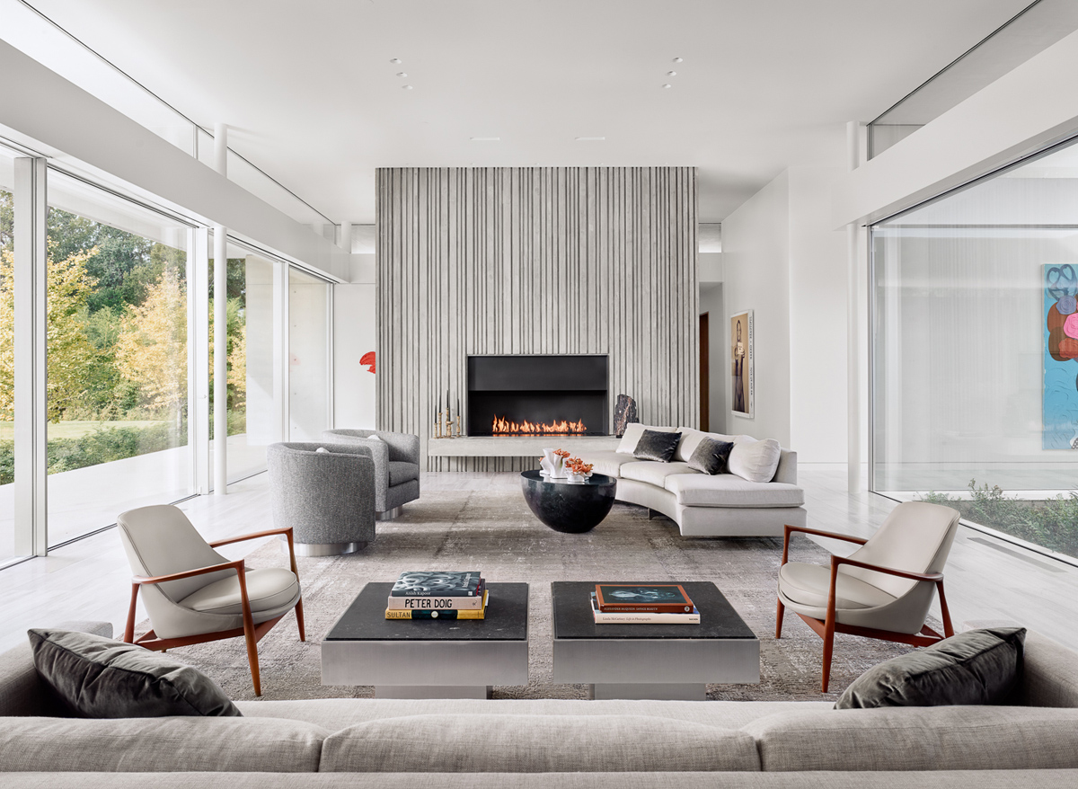 En el interior de un salón gris, la textura del hormigón ondulado se traduce en una llamativa chimenea. Un sofá curvo suaviza la linealidad del moderno diseño de la chimenea. Los sillones redondeados complementan la suave silueta del sofá.
