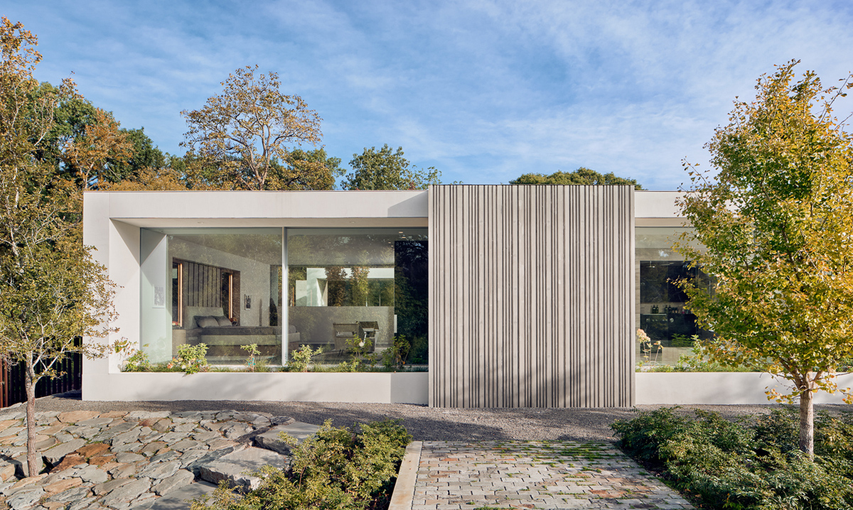 Los bordes de la arquitectura lineal de la casa están decorados con frondosas plantas.